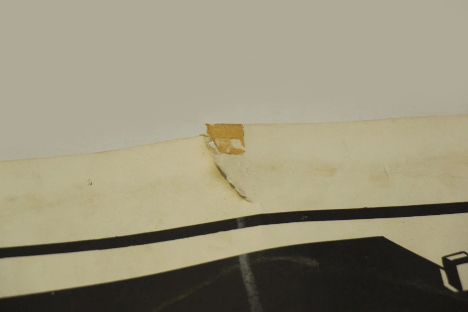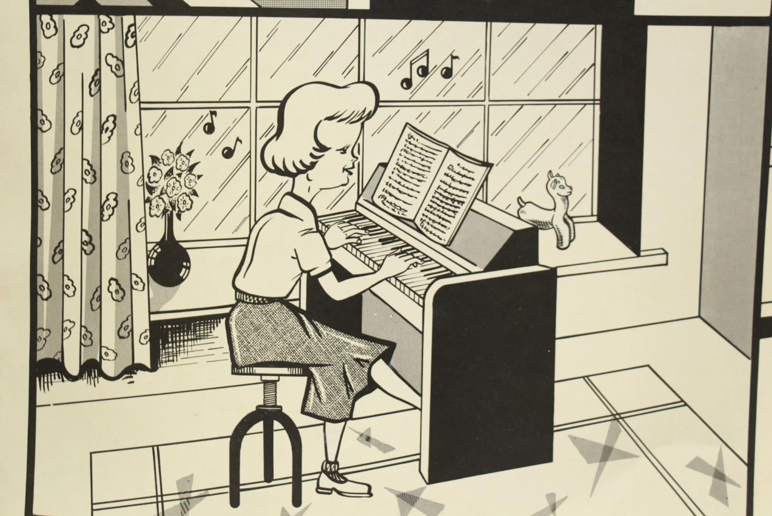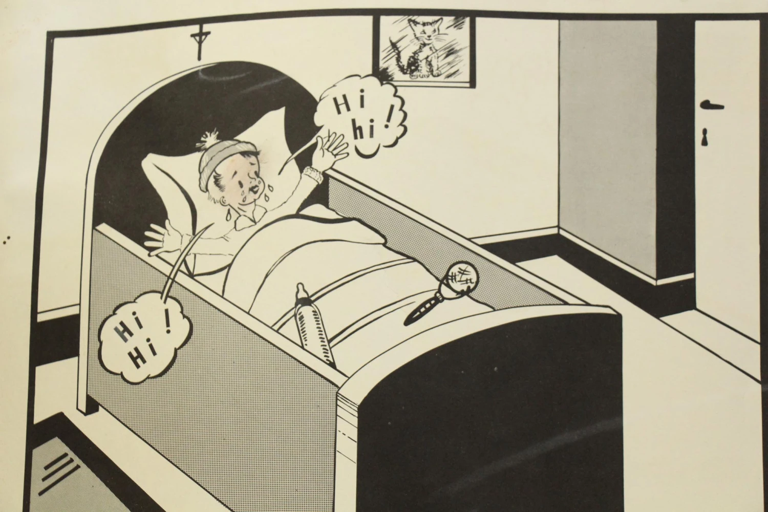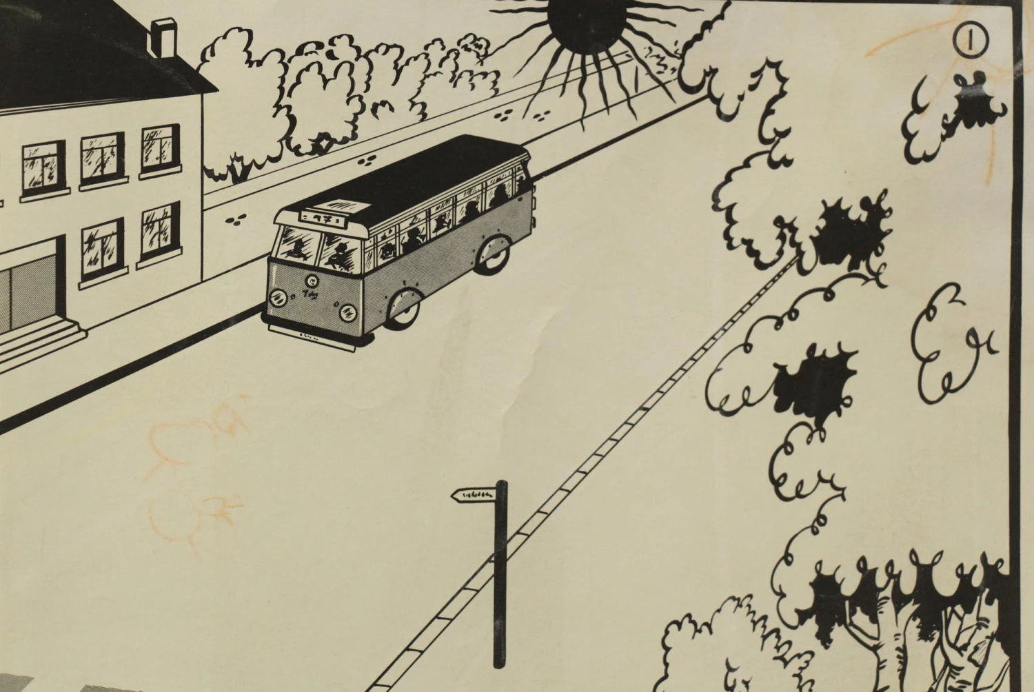 Belgian school poster depicting four different scenes. One is a baby crying “Hi! Hi! Hi!” in his crib. Another scene depicts a mother sleeping in her bed. The bottom right corner has a boy playing with a toy train set with a sleeping dog next to him and the last scene is a young woman playing piano. The entire poster is black and white in a vintage setting. We make custom frames out of reclaimed moldings. Please inquire an additional price for framing.