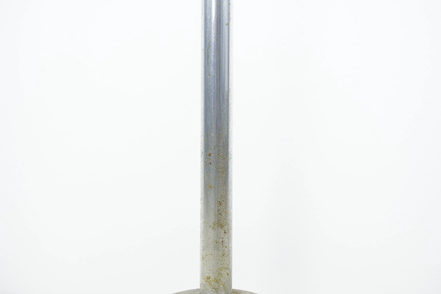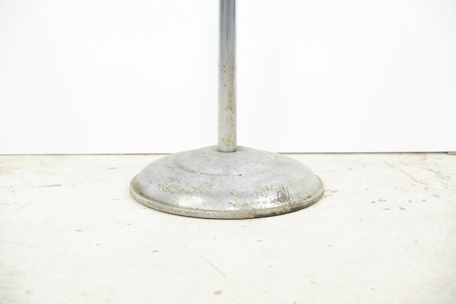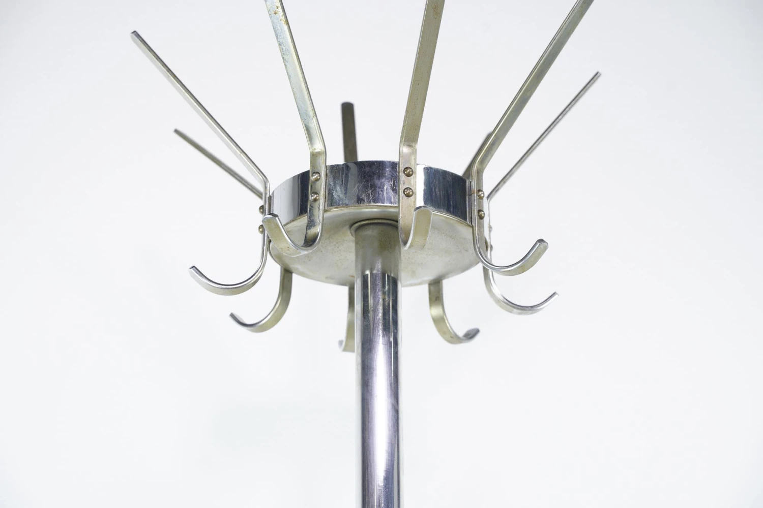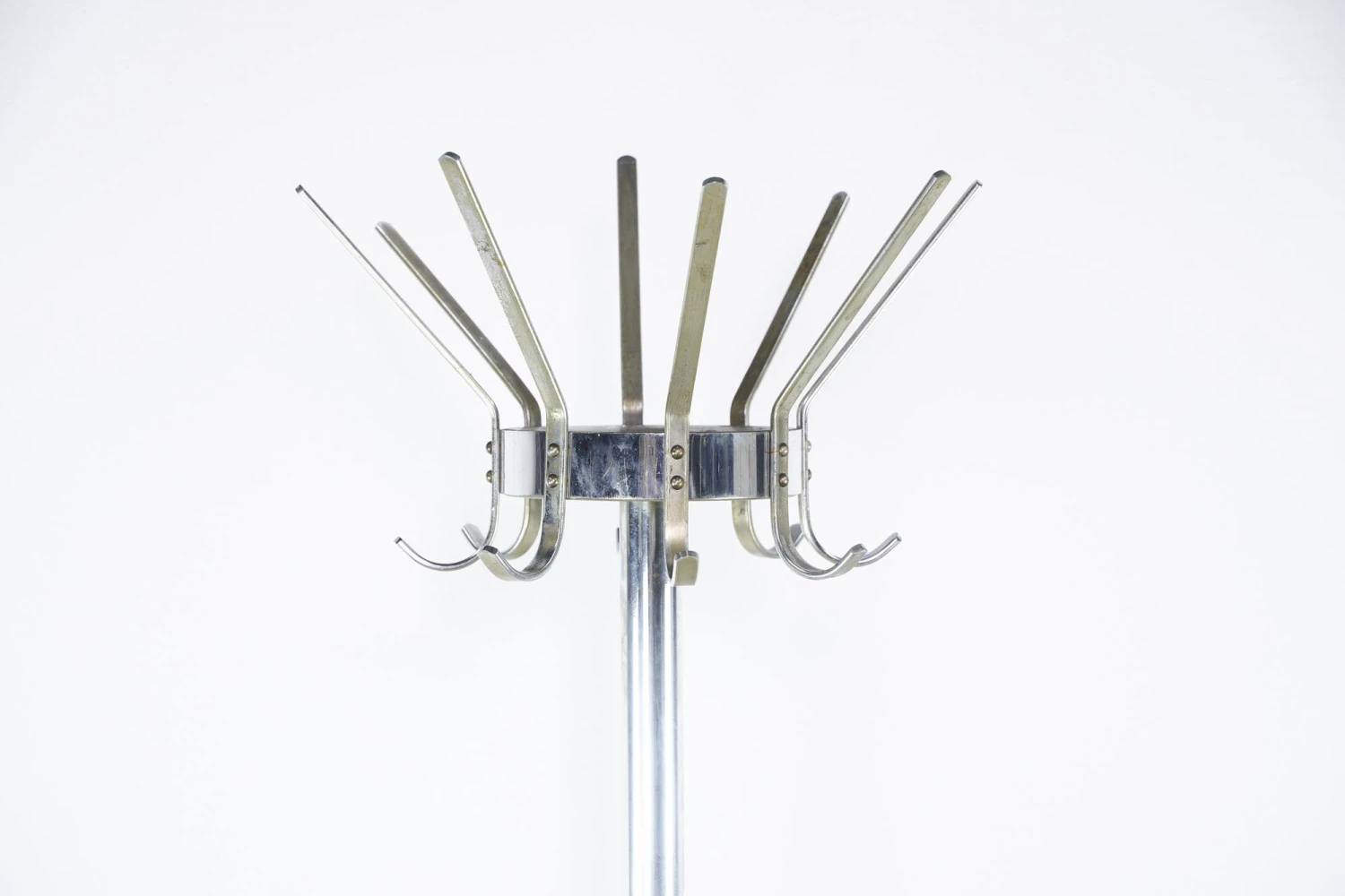 This vintage stainless steel eight double hook coat rack offers a sleek and durable storage solution for coats and accessories. Its design combines functionality with a touch of retro style for any space. This is in good condition, with some scratches and rust. One available.