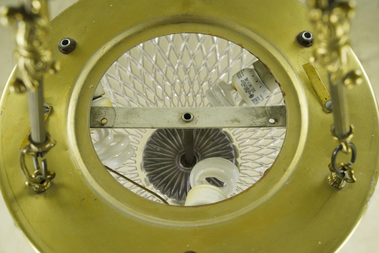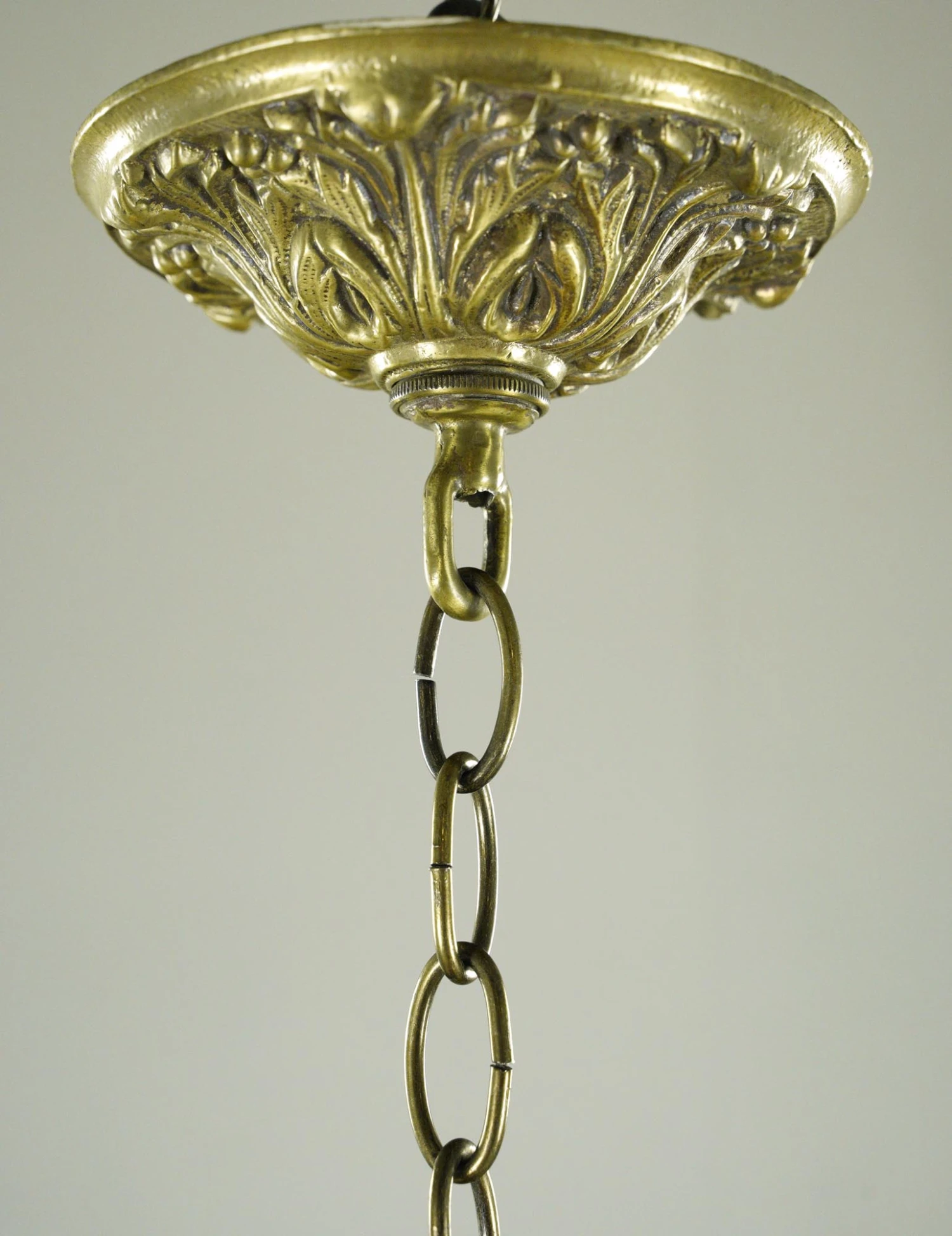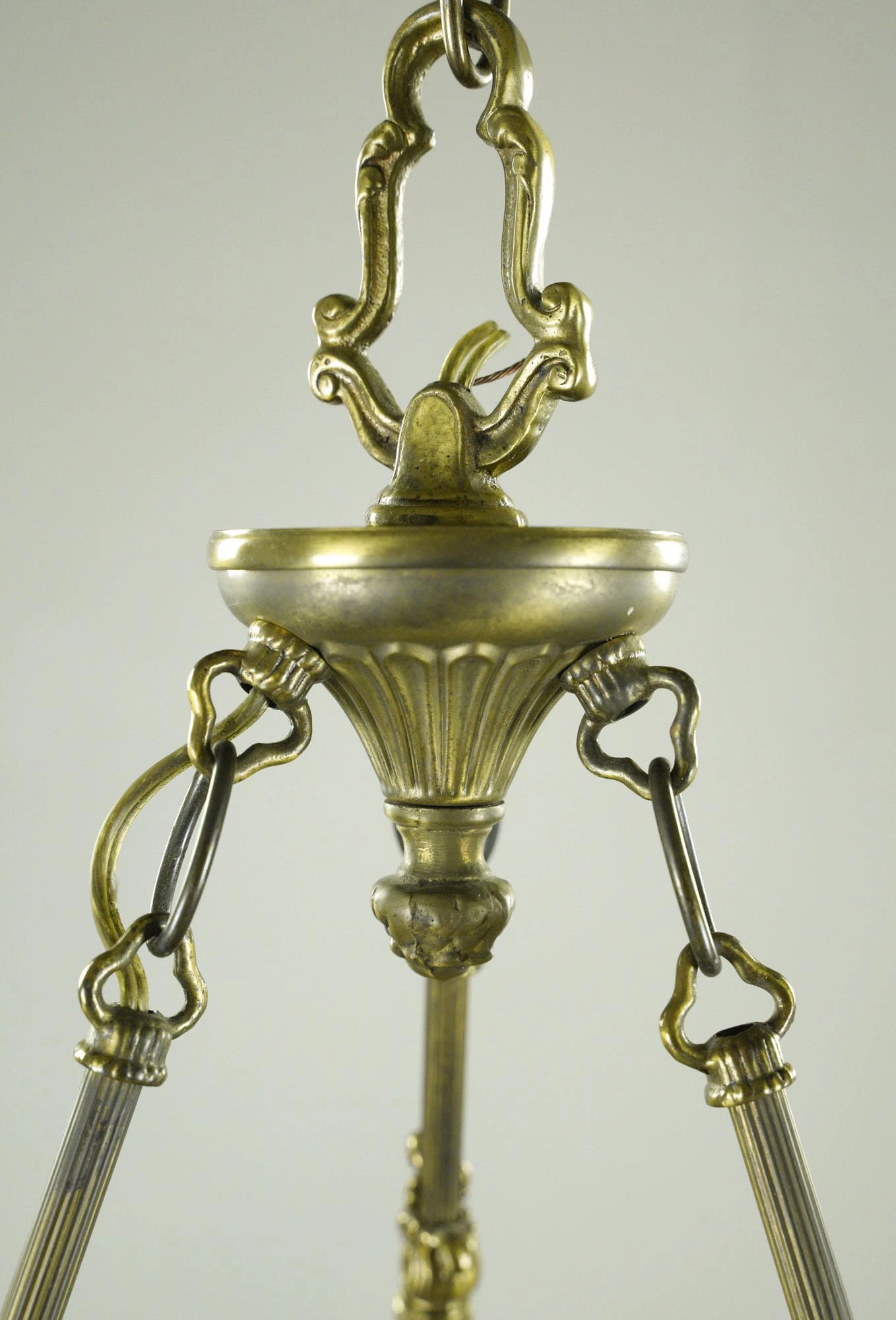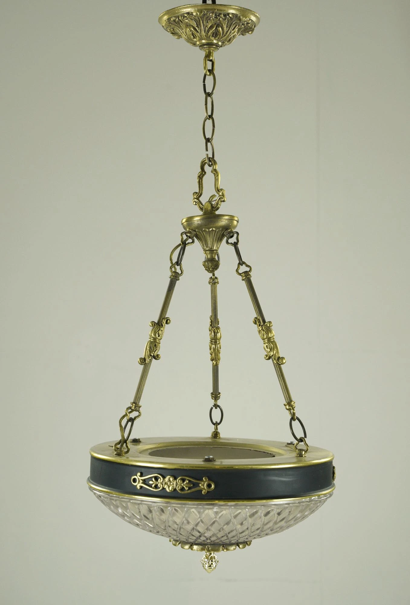 Empire style pendant light with a cast glass dish and bronze decorative frame. These elegant lights graced many of the main corridors of the Waldorf Astoria. This requires three standard medium base bulbs. The price includes restoration of cleaning and rewiring. Waldorf Astoria authenticity card included with your purchase. Priced each.