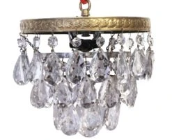 This two bulb fixture has crystals attached to two rings plus the mounting ring. These Traditional petite 1940s flush mount chandeliers graced the entries of several suites of the Waldorf Astoria Hotel. Price includes restoration. See WAN252414, WAN252414C for larger sizes of similar design. Priced each.