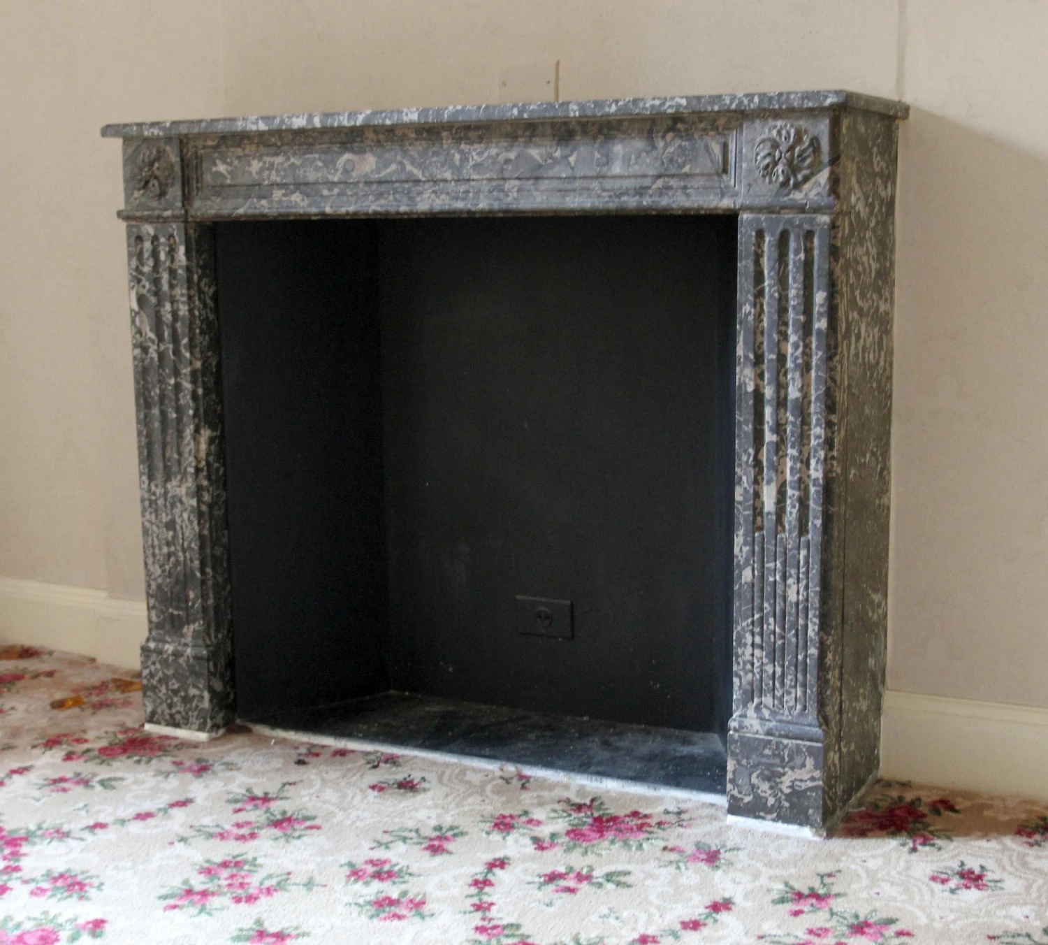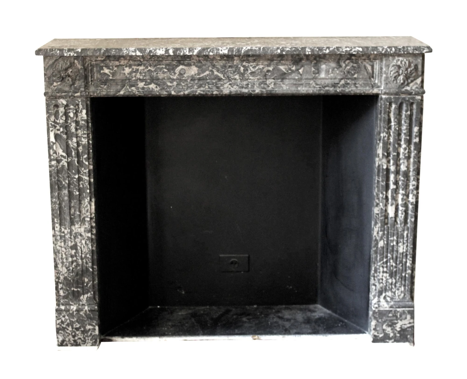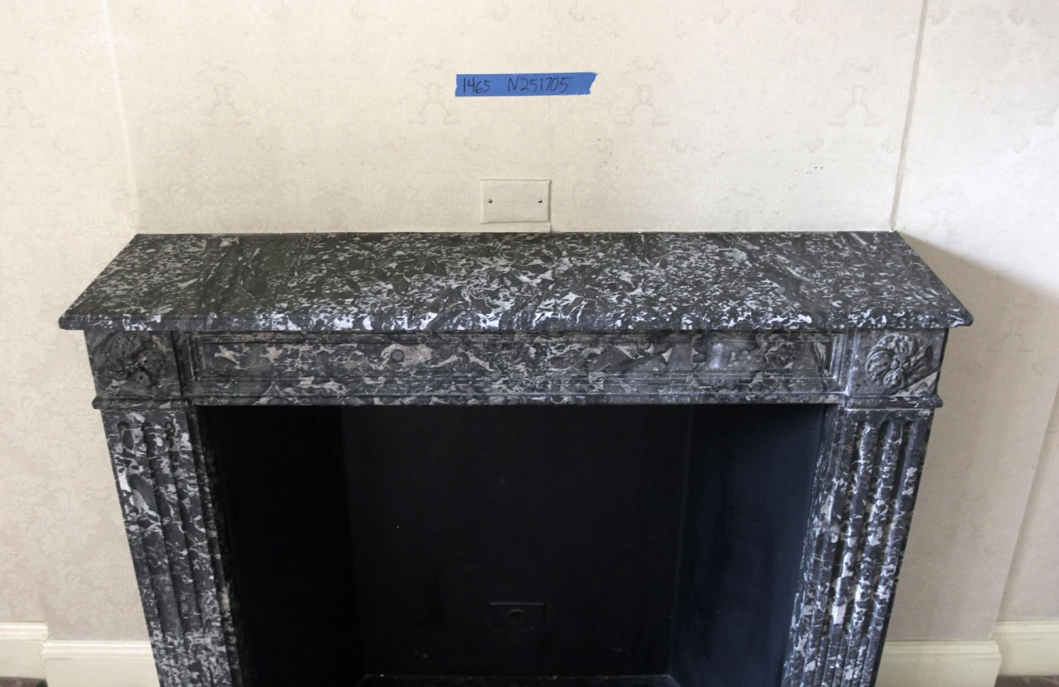 Classic gray and white veined marble mantel with fluted vertical supports and floral corner motifs. The mantel is in very good to excellent condition, having wear consistent with its age. This antique mantel was imported from Europe to furnish the Waldorf Astoria NYC, which opened on October 1, 1931. It was original to suite 1465. No hearthstone is available.