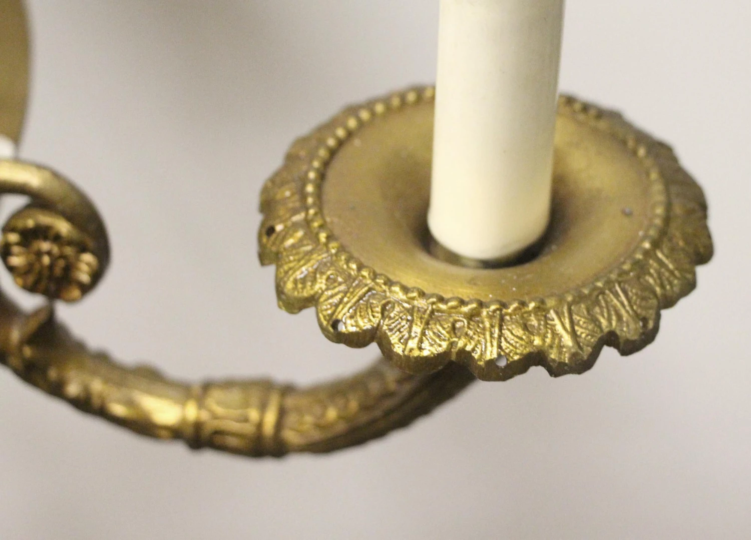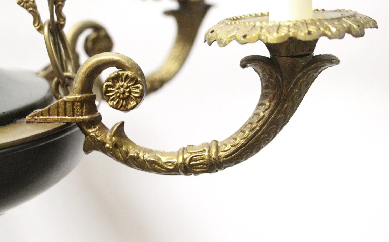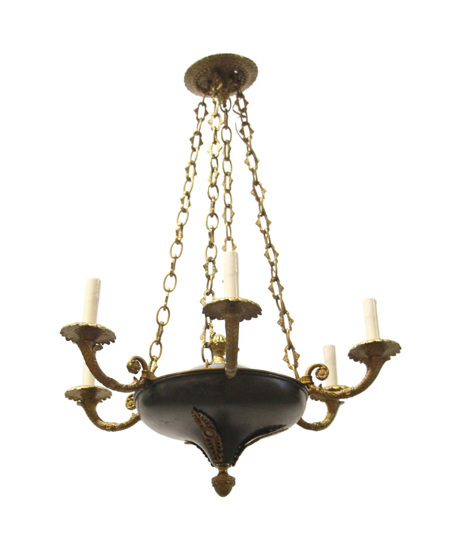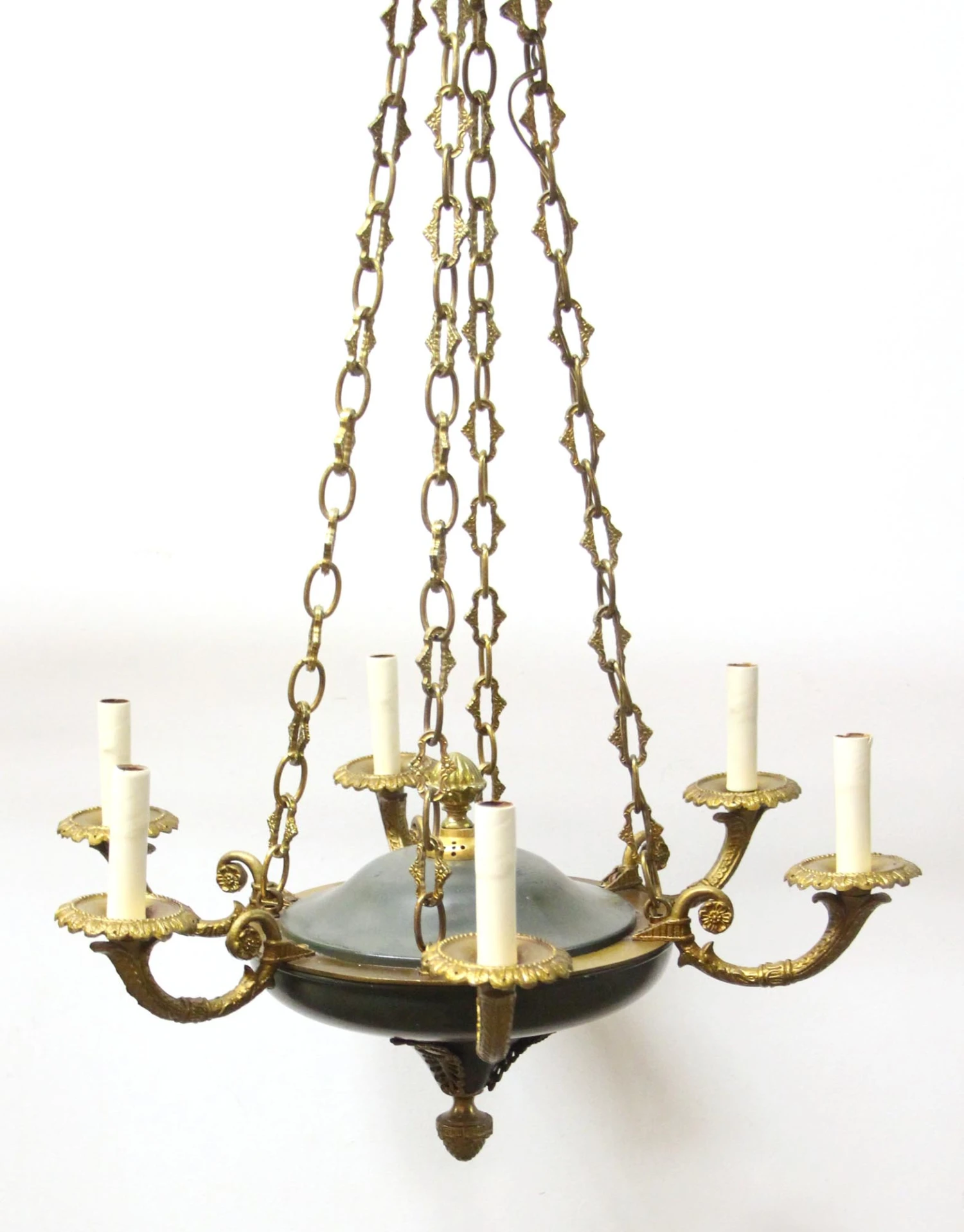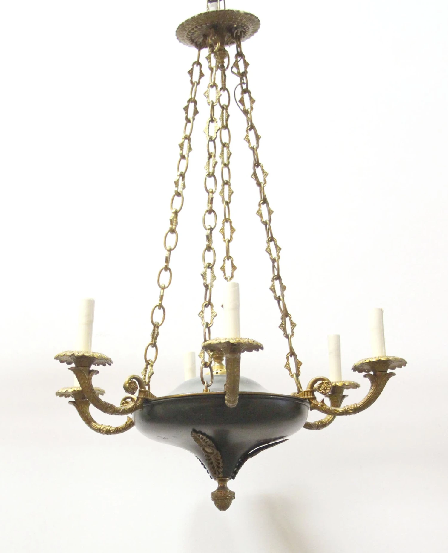 Bronze Empire chandelier with six arms and fine detail. This is original to the Waldorf Astoria Towers. Price includes restoration.