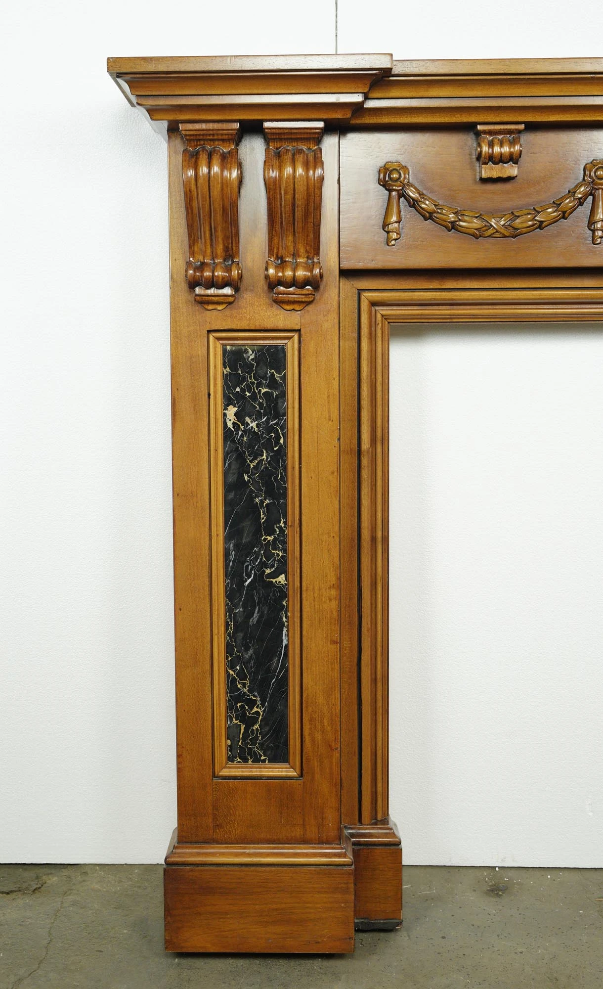 This mantel is a new production combining components of solid wood with laminates. As with most everything done at the Waldorf Astoria, the quality of the craftsmanship is outstanding. The vertical supports feature inlaid panels of black and gold Italian Portoro marble. This mantel is classically designed with matching pairs of corbels at the top of each vertical support. The apron is modestly adorned with swags, a pair of miniature corbels, and a center floral motif. The top of the mantel shelf is slightly worn, however the finish on the rest of the mantel is in excellent condition. The inner trim at the firebox surround is separated from the main mantel. The top layer of the shelf needs to be reattached as well. This mantel was part of the decor in the NYC Waldorf Astoria conference room, named in recognition of the Duke of Windsor.