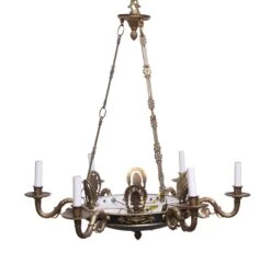 Empire style brass chandelier with wreath and crest details, a black and gold finish and six candlestick arms. These majestic chandeliers adorned many of the main corridors of the Waldorf Astoria Hotel. Priced each. Price includes restoration. Please specify the overall drop that is needed upon purchasing.