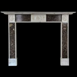 19th Century English Regency brown and white marble mantel with inset fossil marble and carvings of cherubs with fruit baskets. This mantel was one of a group of antique mantels imported from Europe and installed in the Waldorf Astoria Hotel in the 1930s when the hotel was first built on Park Avenue. It is original to suite R on the 13th floor of the hotel. The original hearth is not included.