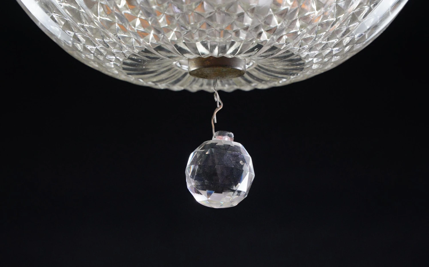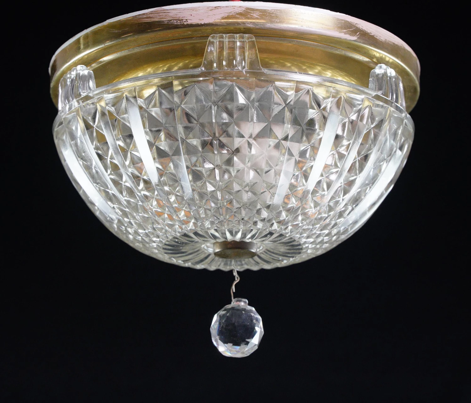 This Waldorf Astoria etched glass & brass flush mount light is a luxurious lighting fixture. Its intricate etched glass design and brass accents exude opulence and sophistication, adding a touch of grandeur to any space. There is paint on the mount, but this can be removed. The price includes restoration of cleaning and rewiring. This was original to the Waldorf Astoria, New York on Park Avenue.