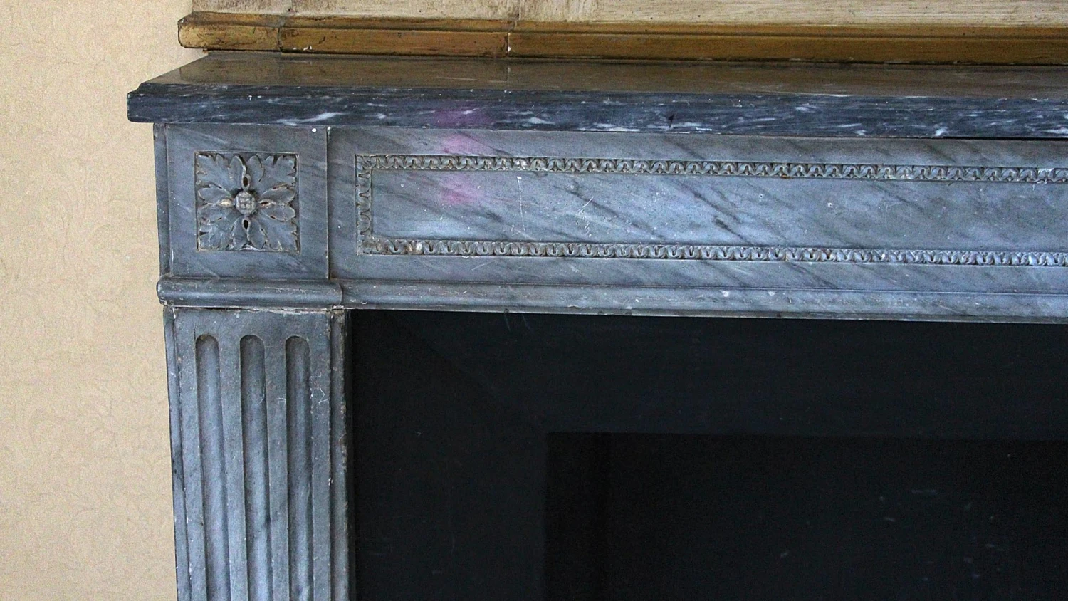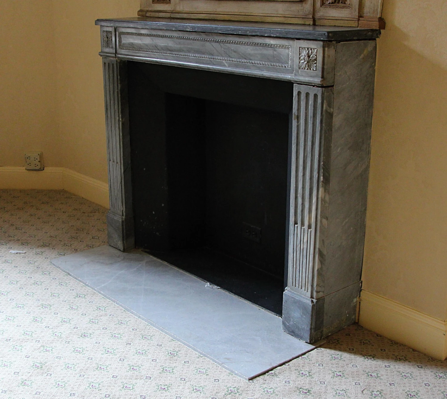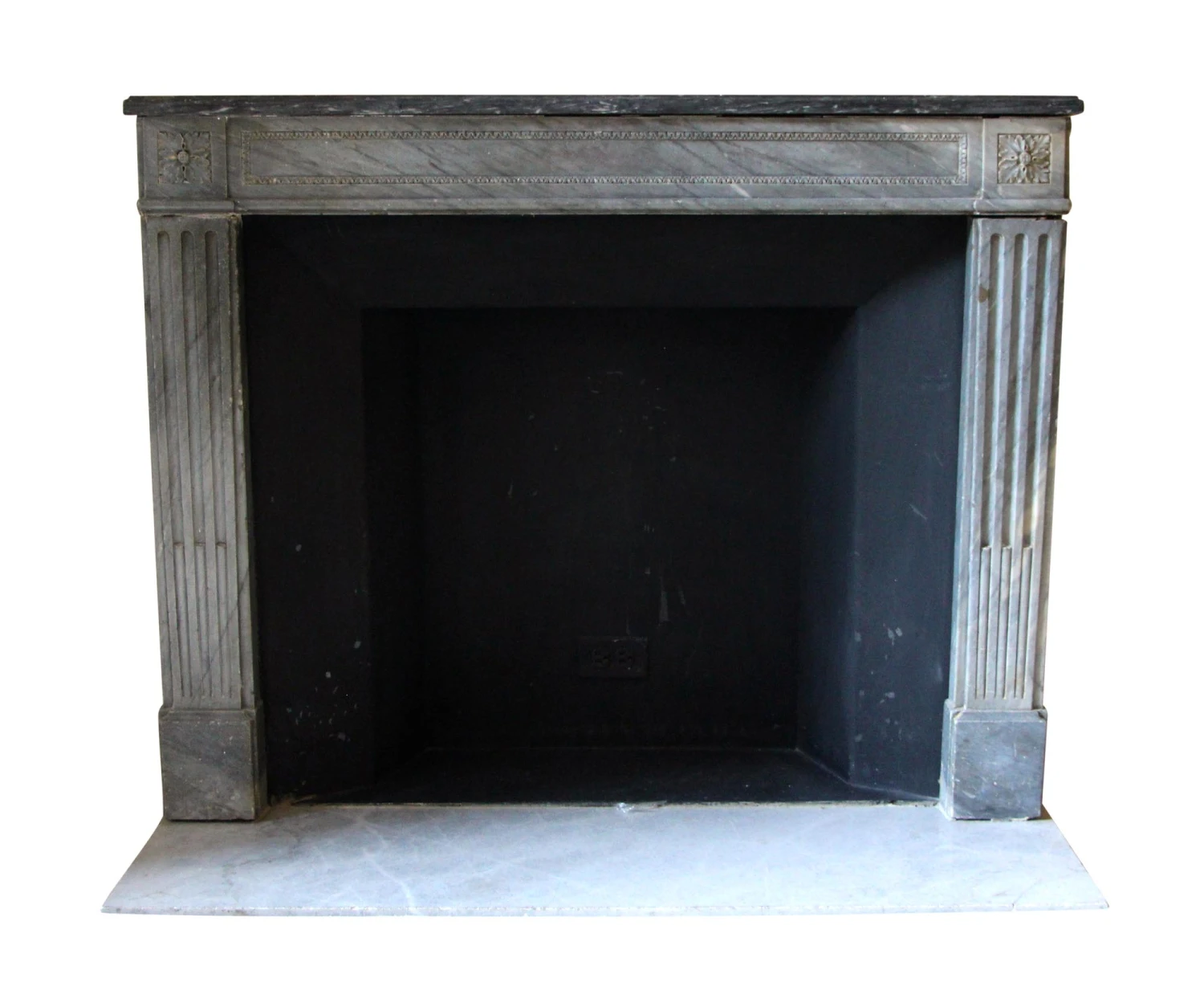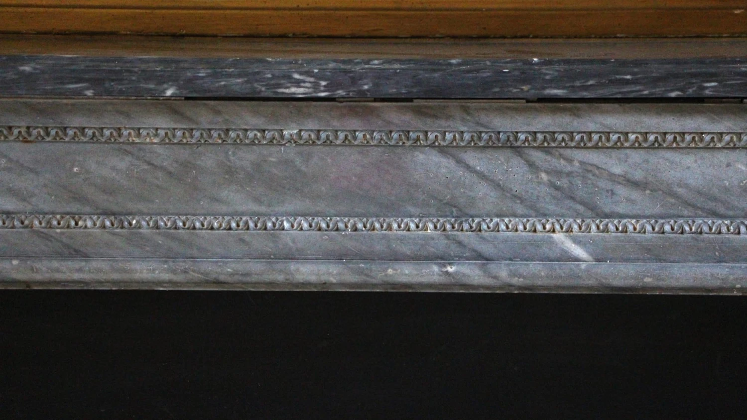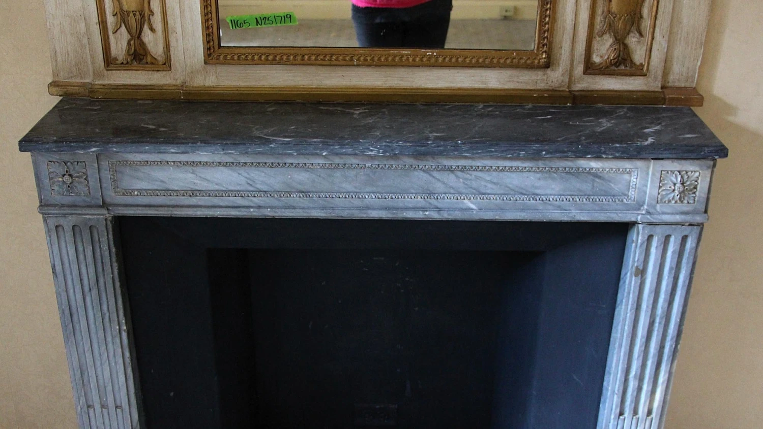 Louis XVI French Regency dark gray marble mantel with a black shelf. This mantel was one of a group of antique mantels imported from Europe and installed in the Waldorf Astoria hotel in the 1930s when the hotel was first built on Park Avenue. This mantel was original to Room 1165. The price is for the mantel only. The mirror is sold separately. It is in good condition, with a repaired crack in the corner and a repaired chip in the leg.