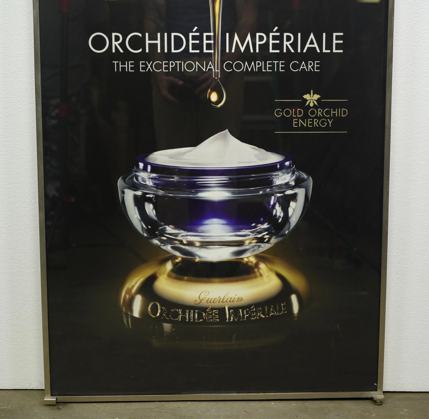 This poster features a captivating advertisement for Guerlain’s Orchidee Imperiale’s high-end skincare products. This advertisement was acquired from the Waldorf Astoria, New York City spa. The poster is not only visually appealing but also comes in a steel frame, adding to its durability and aesthetic appeal. This framed poster is an ideal choice for those who appreciate high-quality skincare products and the art of advertising. It can be a beautiful addition to your home or beauty salon, allowing you to showcase your passion for premium skincare and elegant design. This is in great condition. One available.