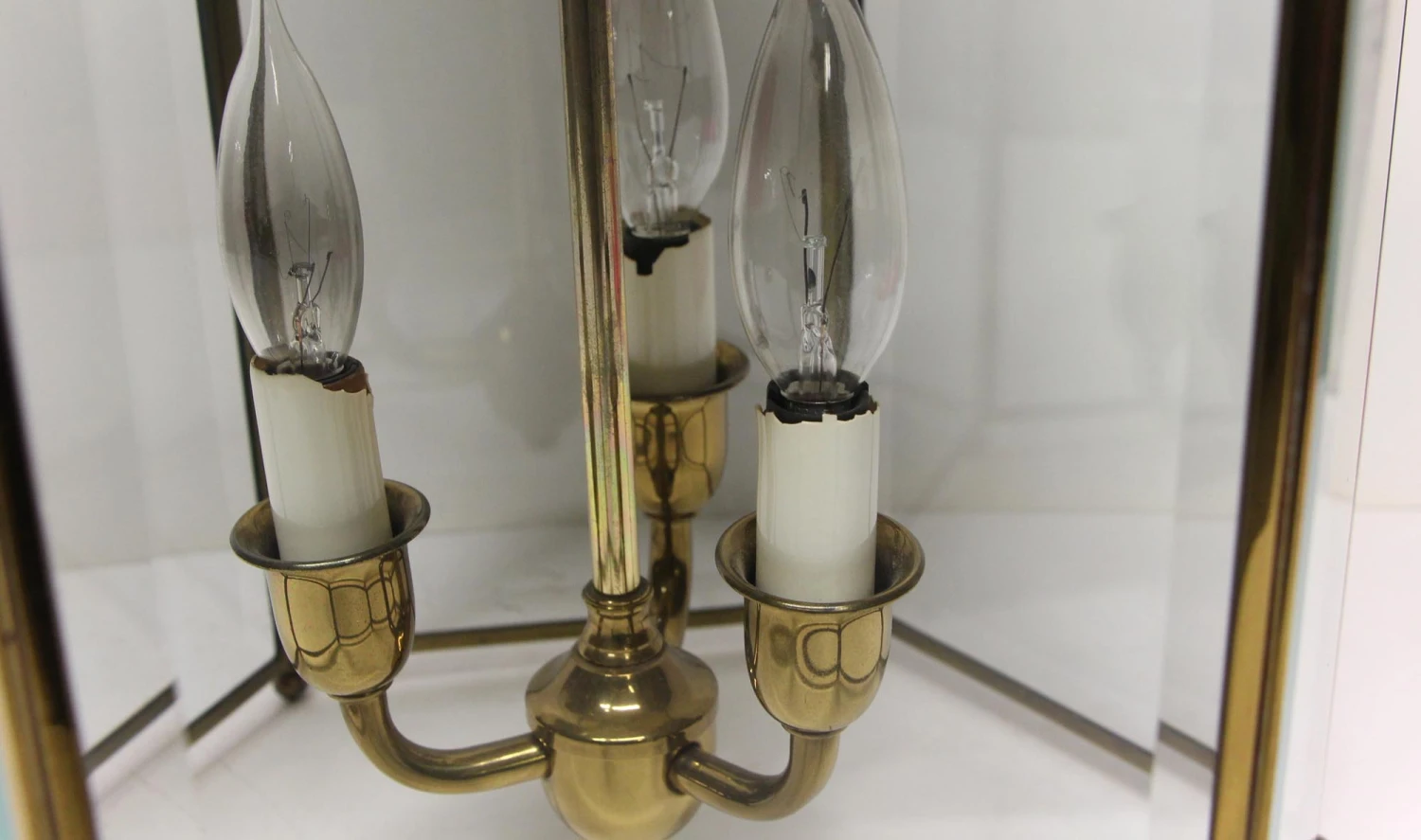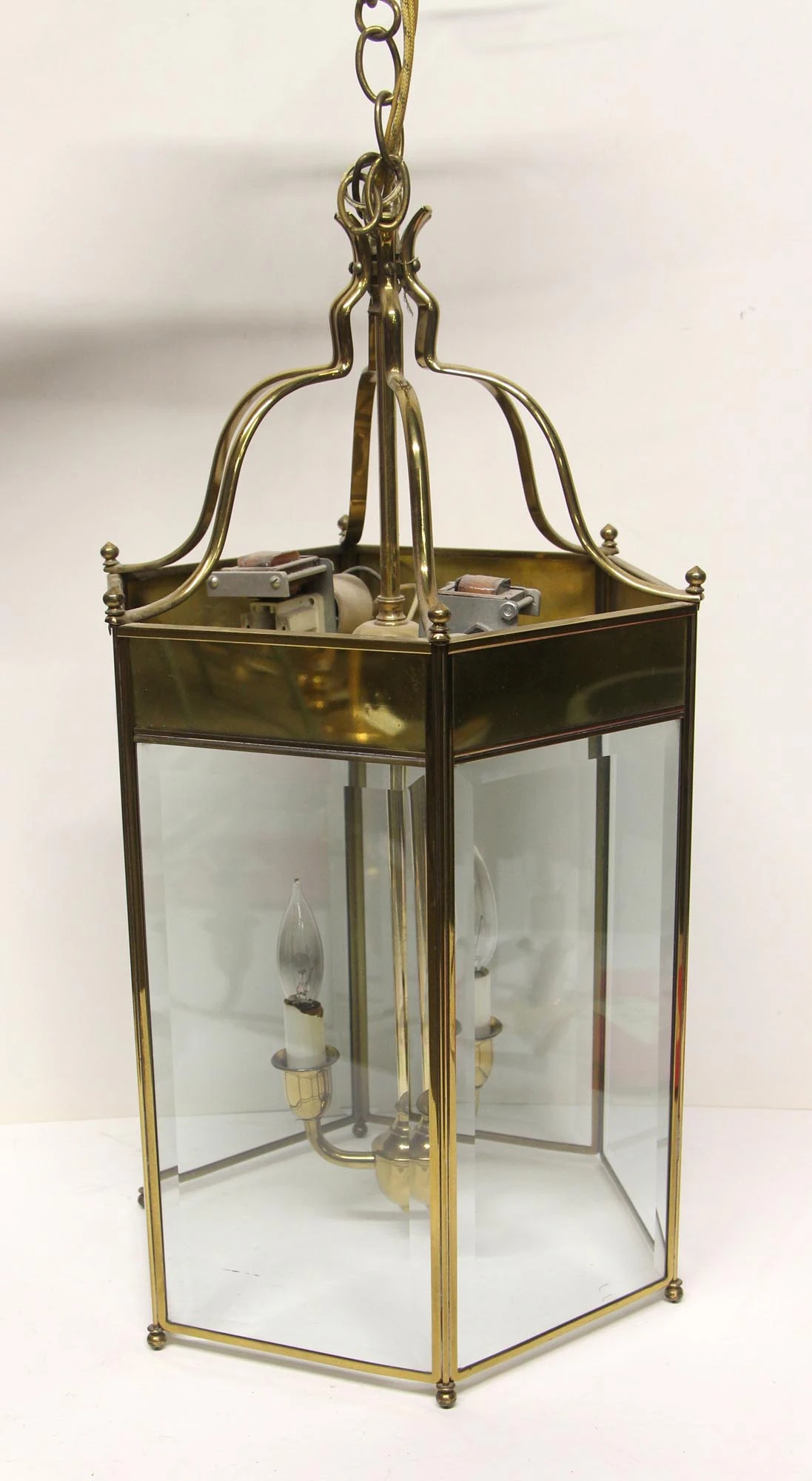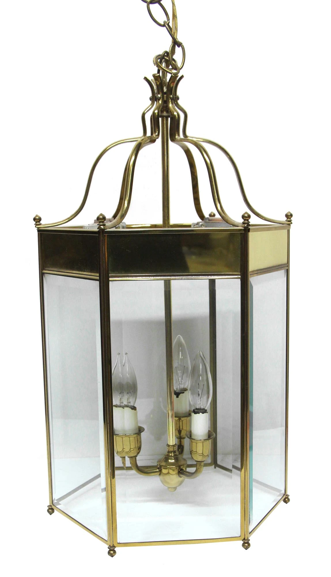 Hexagon shaped brass and glass lantern with three lights and a polished finish. Price includes wiring and cleaning.