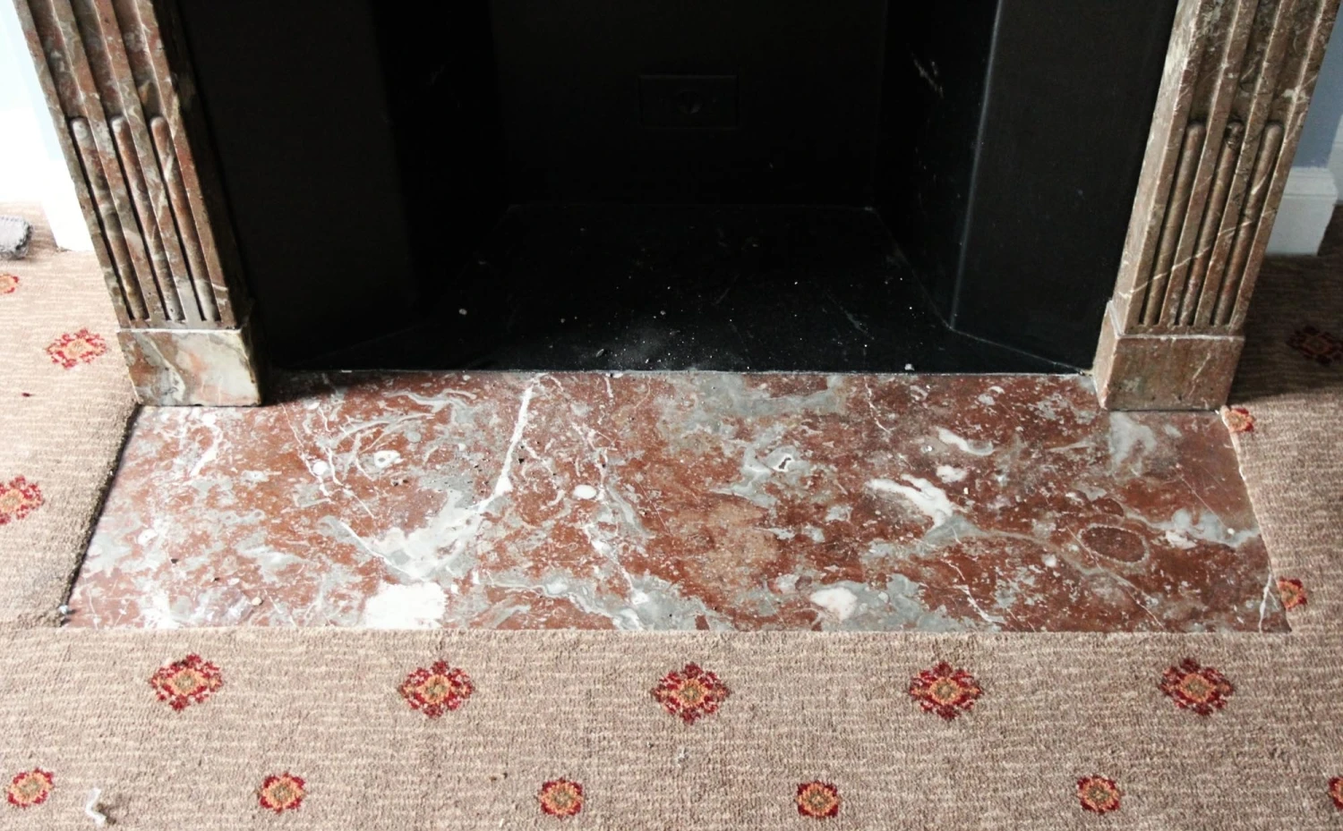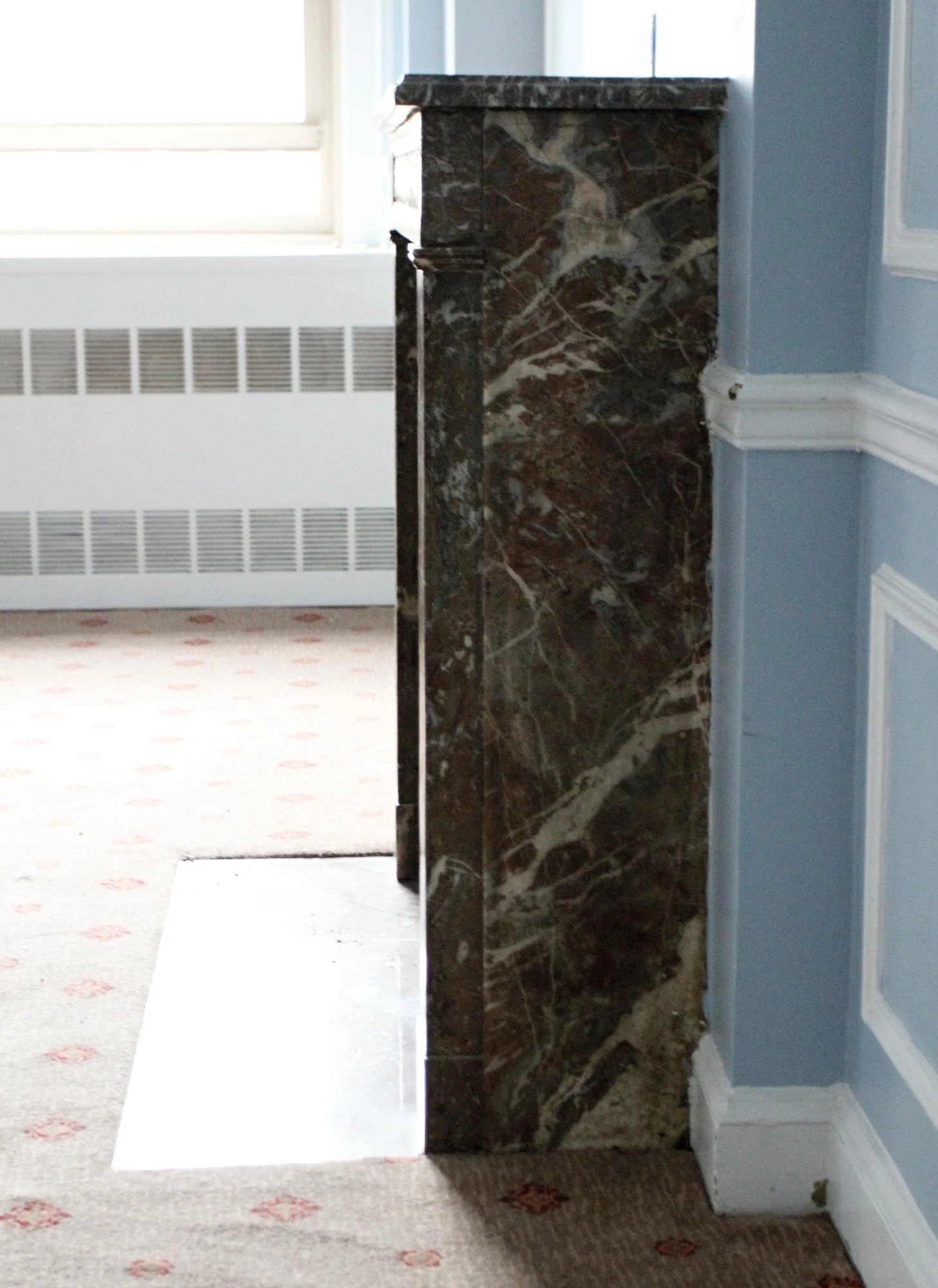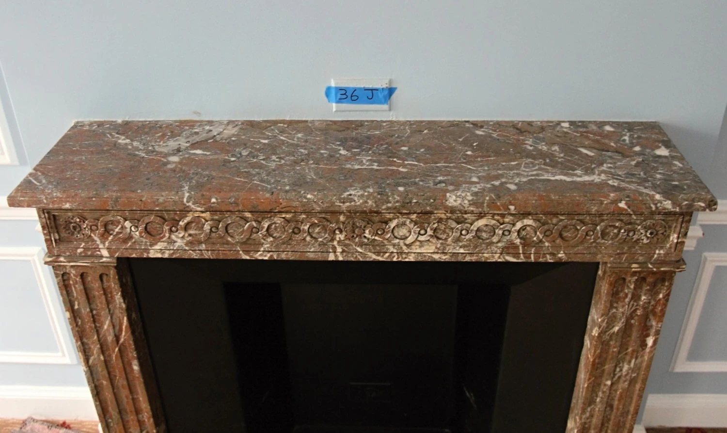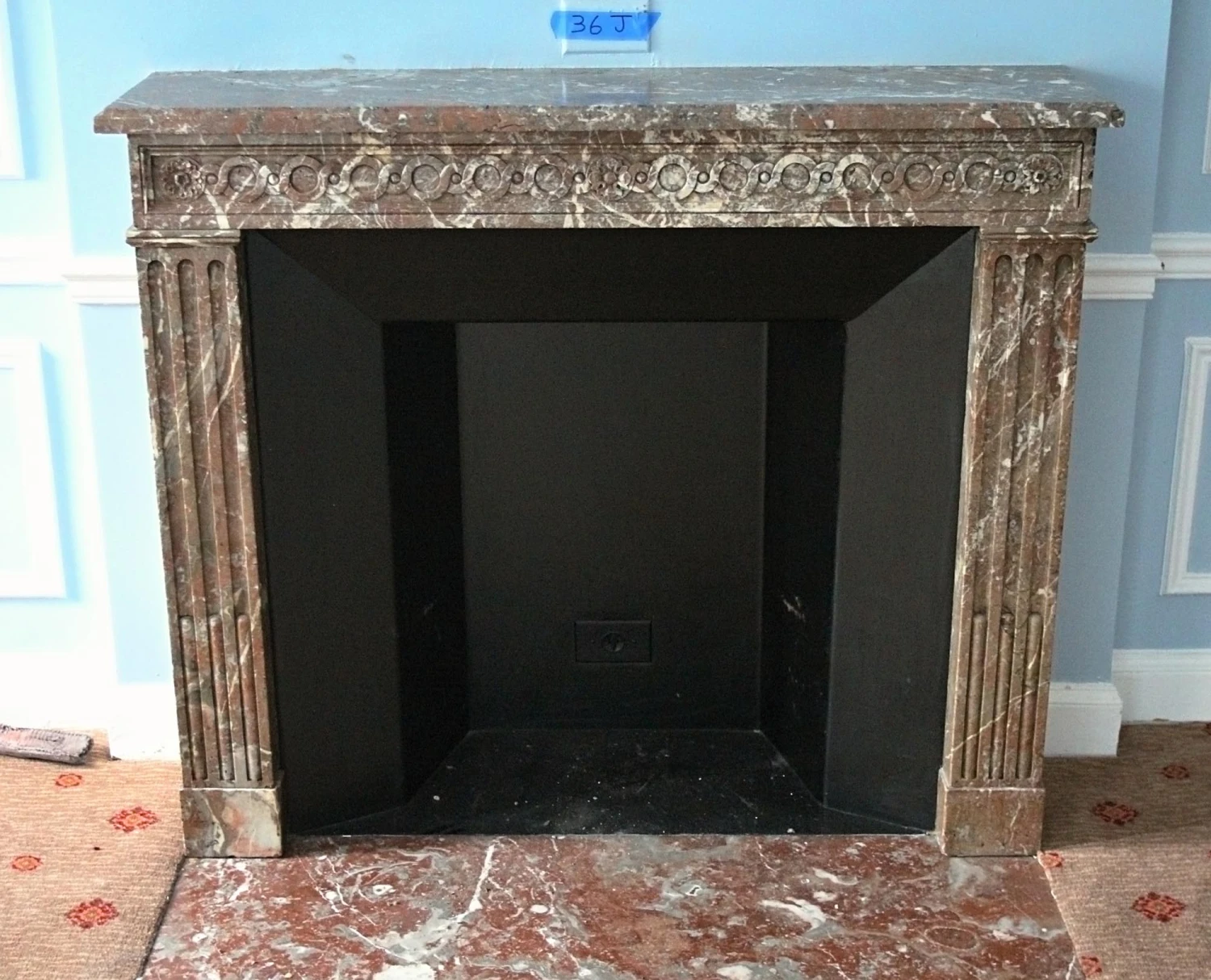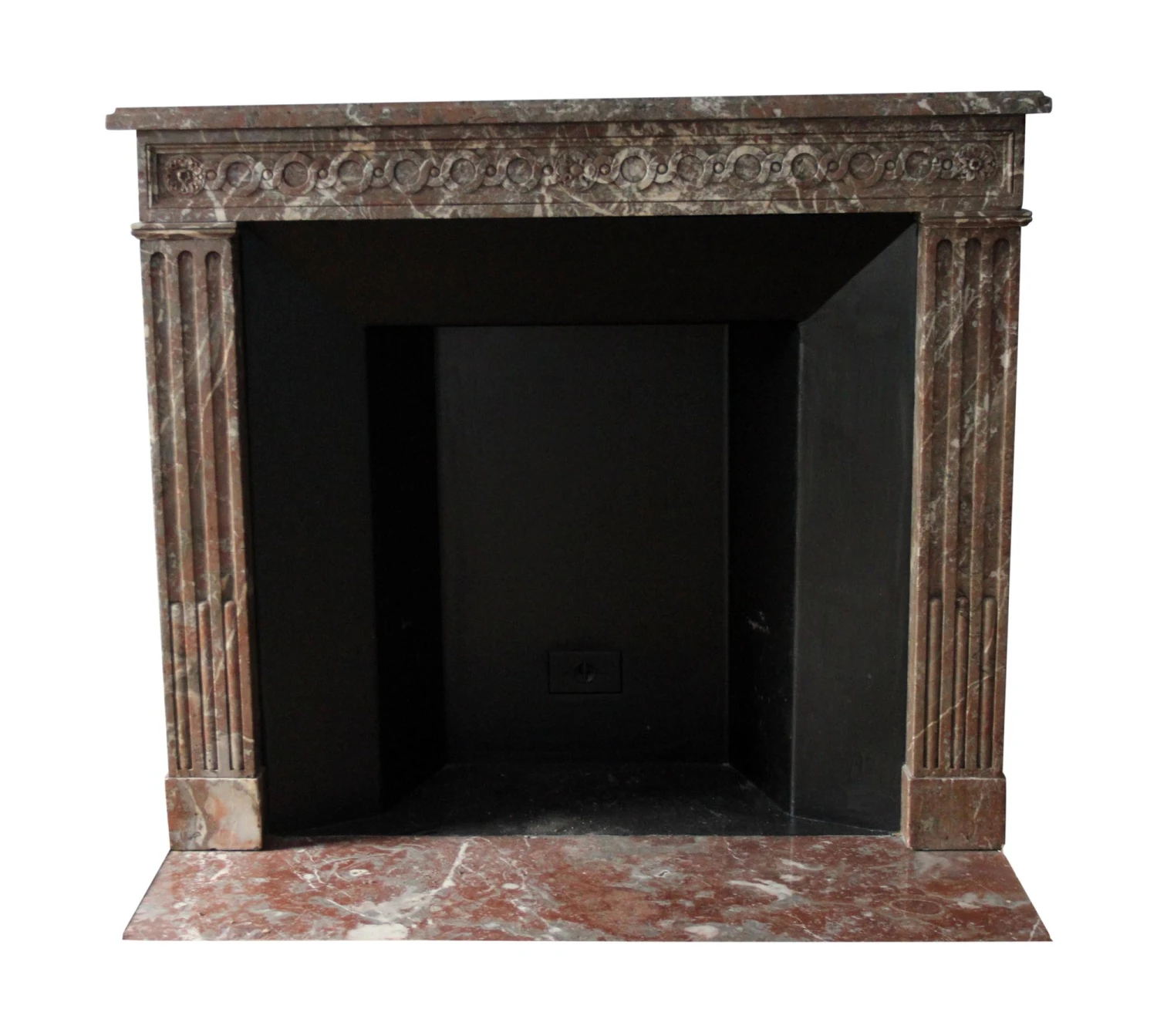 French Regency Louis XVI style burgundy marble mantel with heavy gray and white veining and decorative carvings along the header. This mantel was one of a group of antique mantels imported from Europe and installed in the Waldorf Astoria hotel in the 1930’s when the hotel was first built on Park Avenue, This mantel is original to Room 36J.