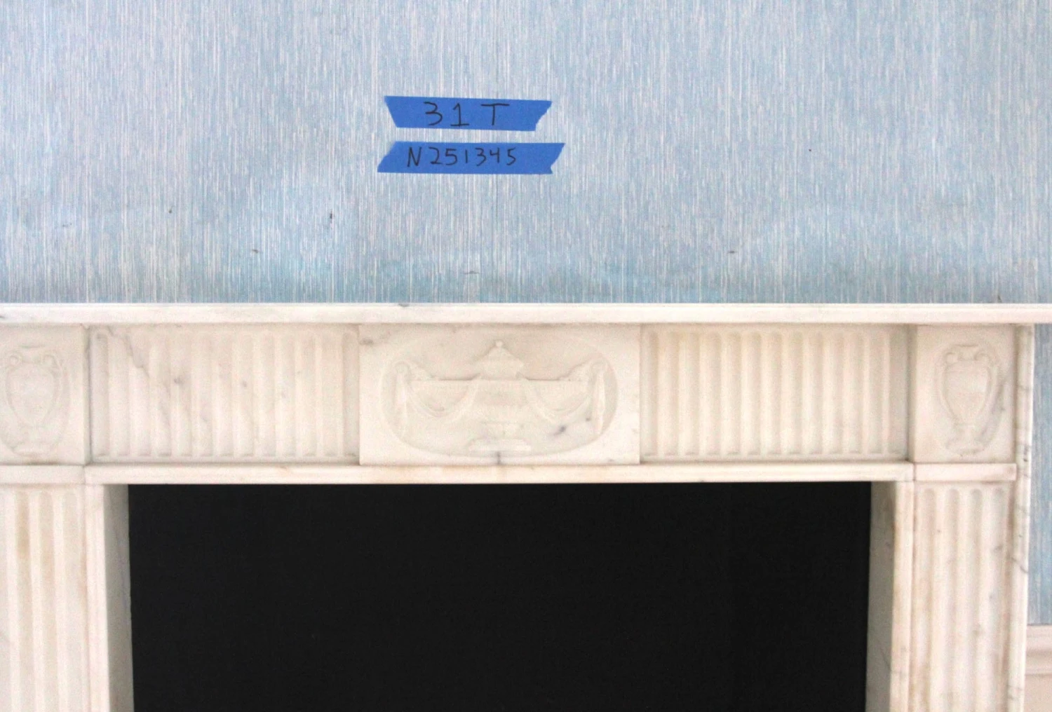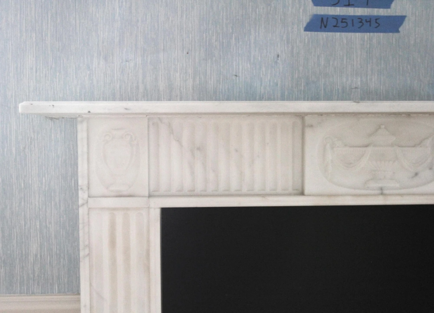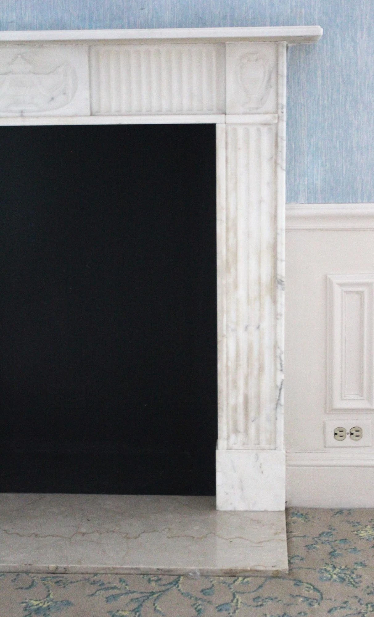 Small white Georgian style carrara marble mantel. The marble hearth is cracked. This mantel is original to suite 31T of the Towers.