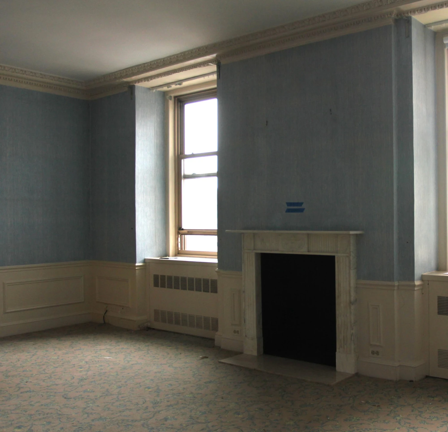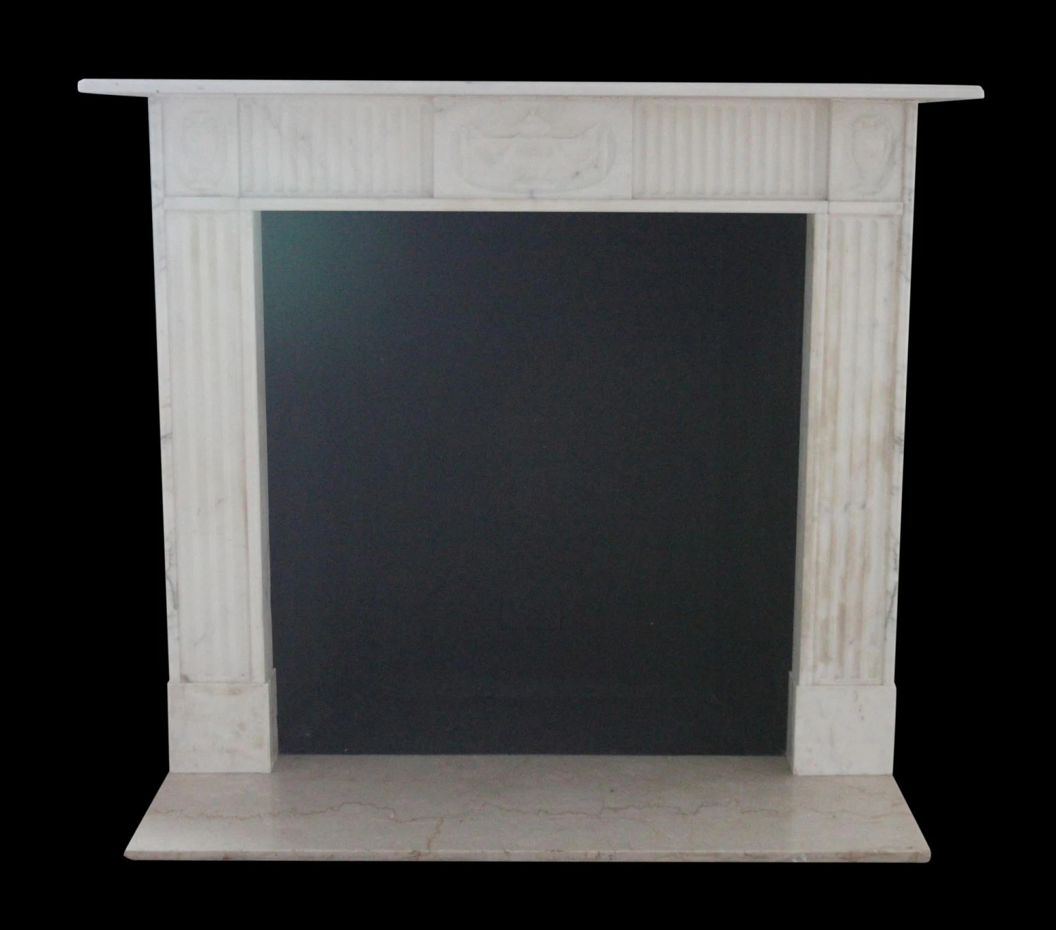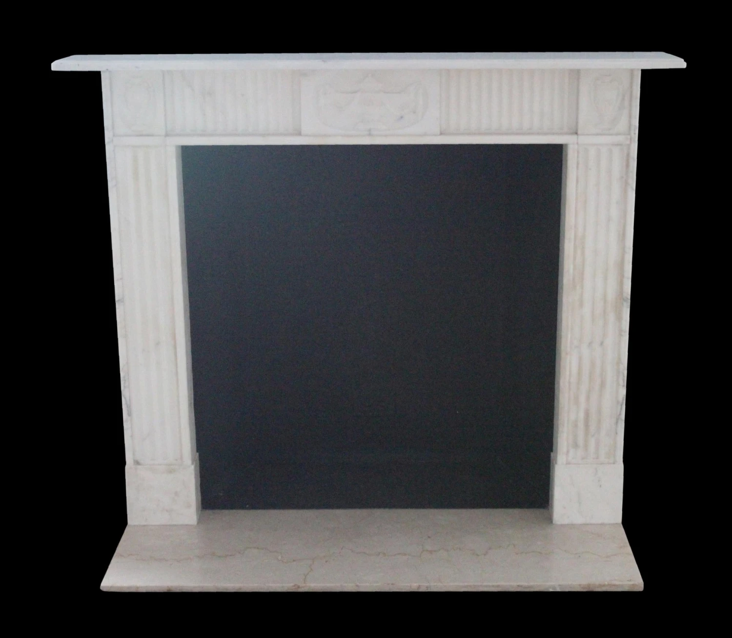 Small white Georgian style carrara marble mantel. The marble hearth is cracked. This mantel is original to suite 31T of the Towers.