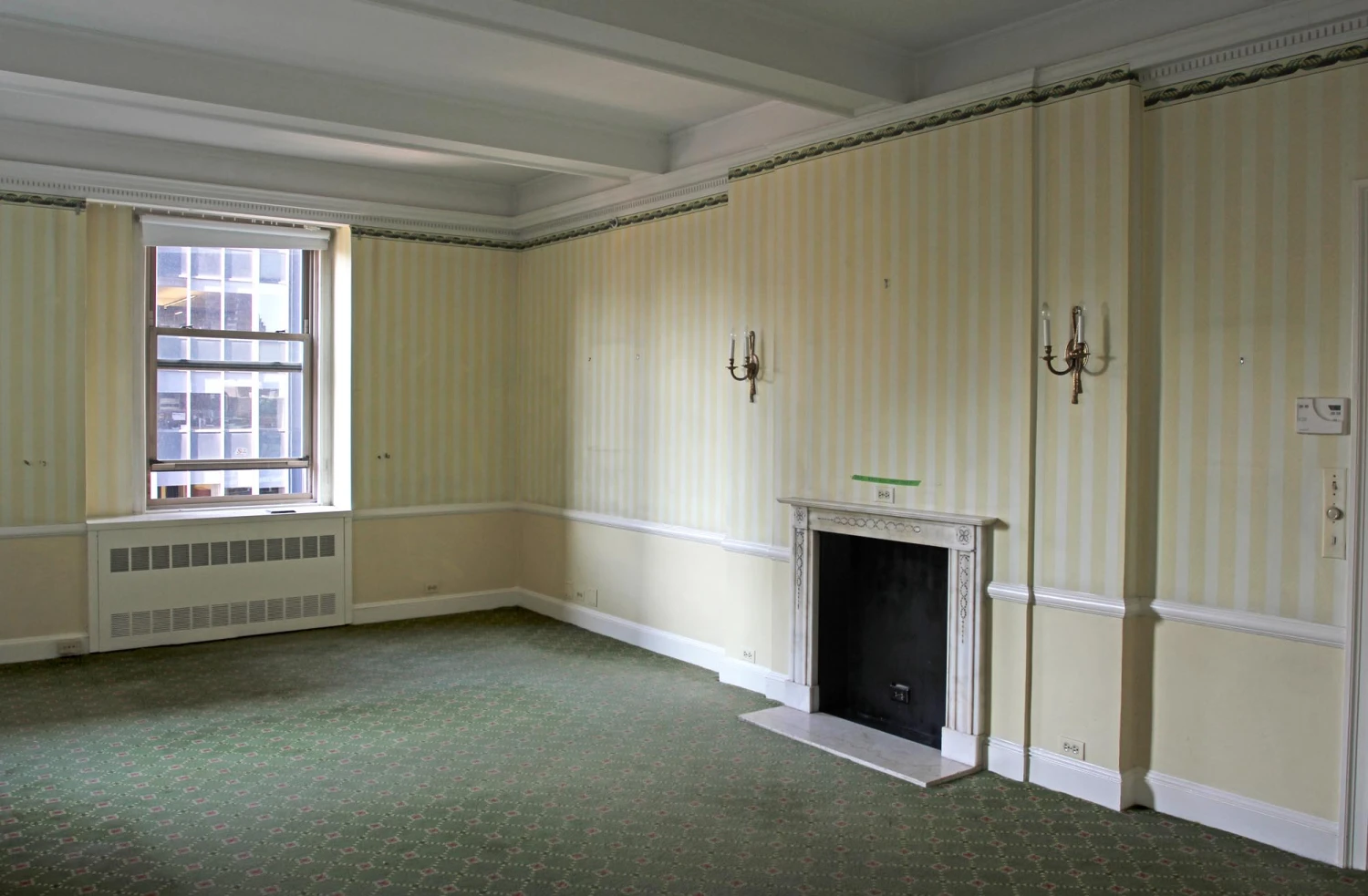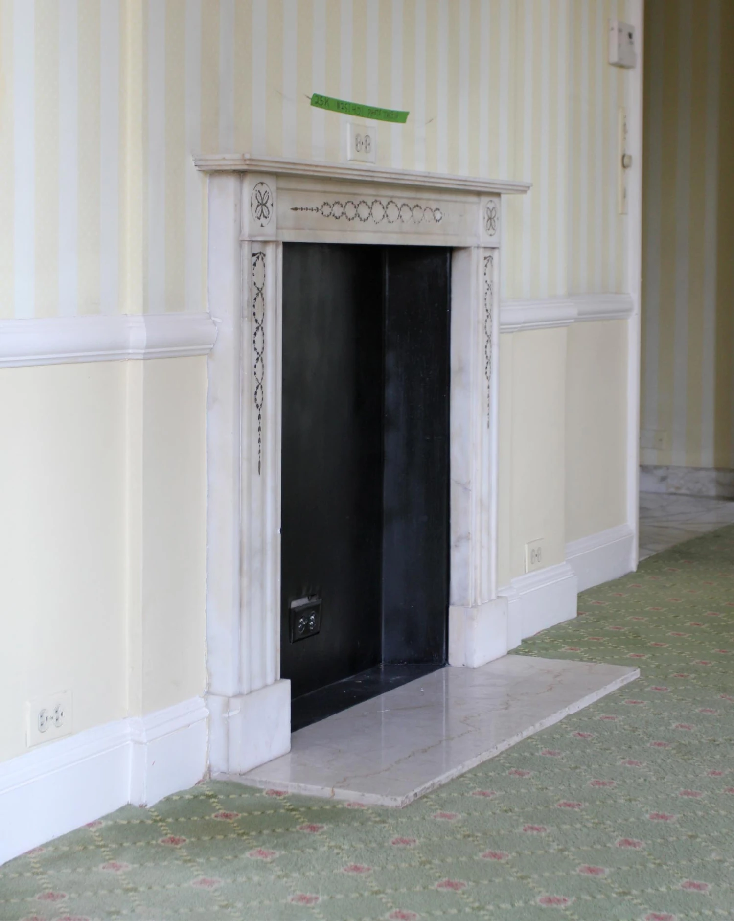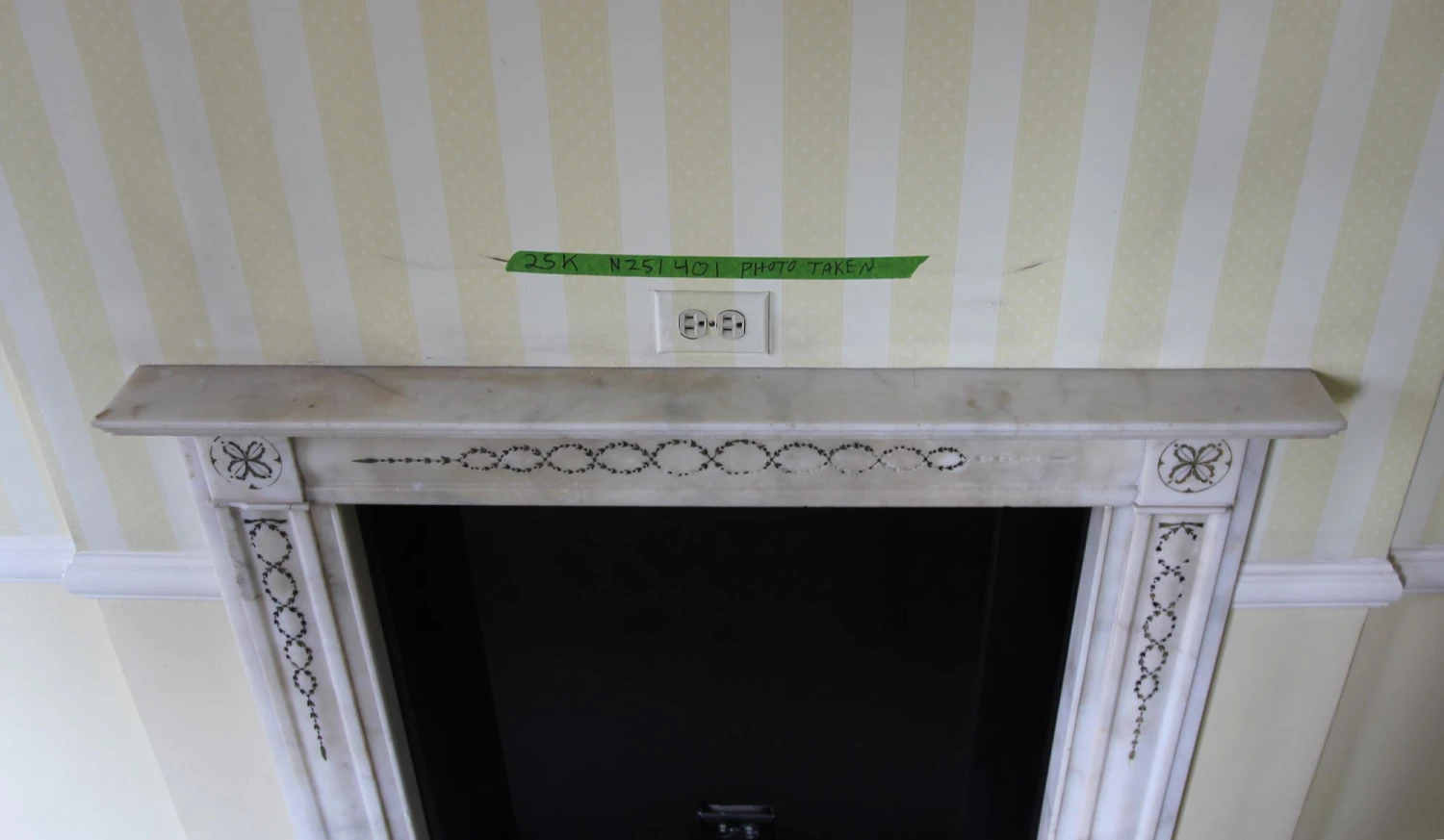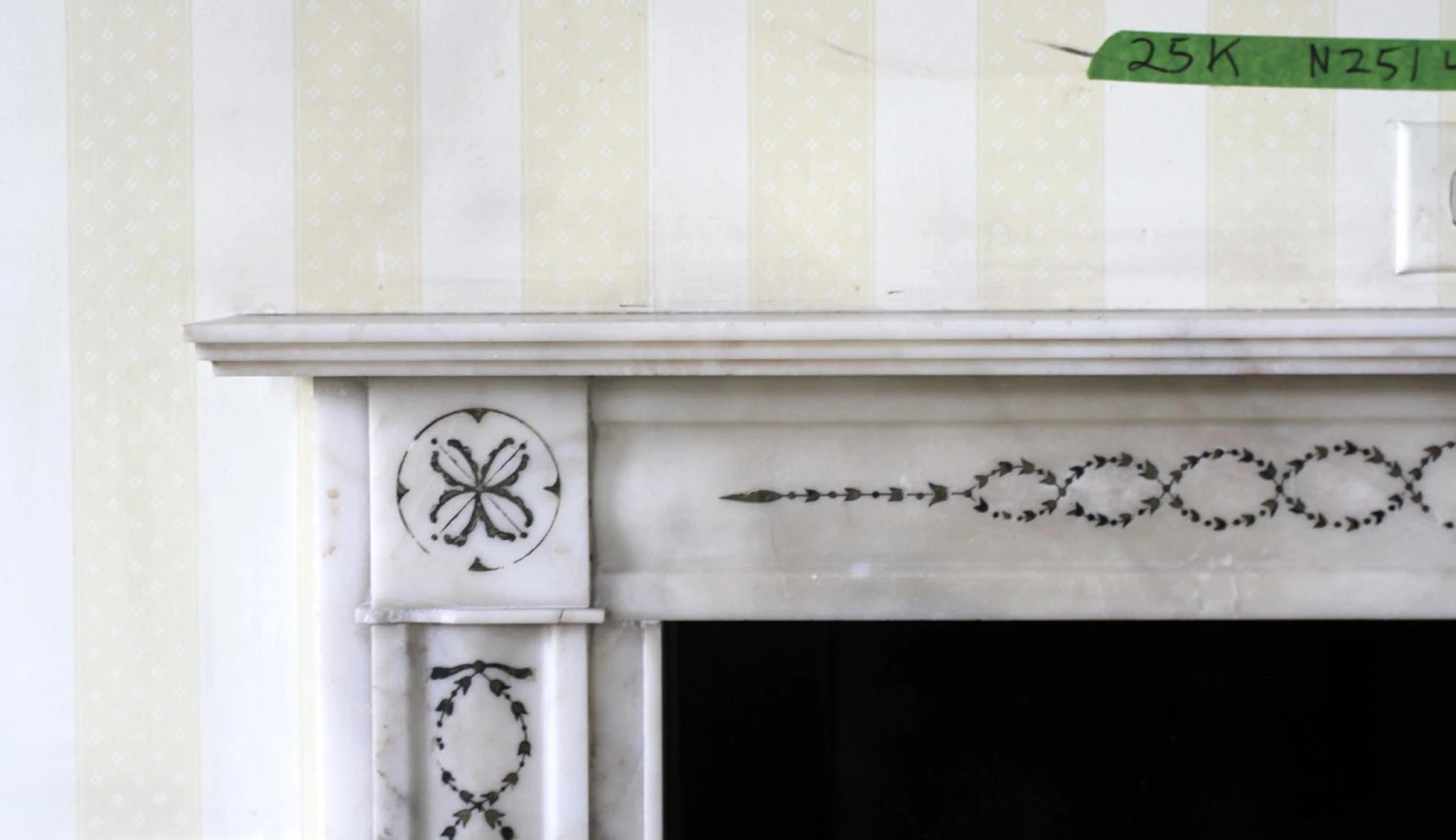 Pictured prior to removal from the Waldorf Astoria, additional pieces of inlay may be missing. This mantel is offered as is. Please note condition of the trim below the corner motifs. Please ask to see further details of its present condition.