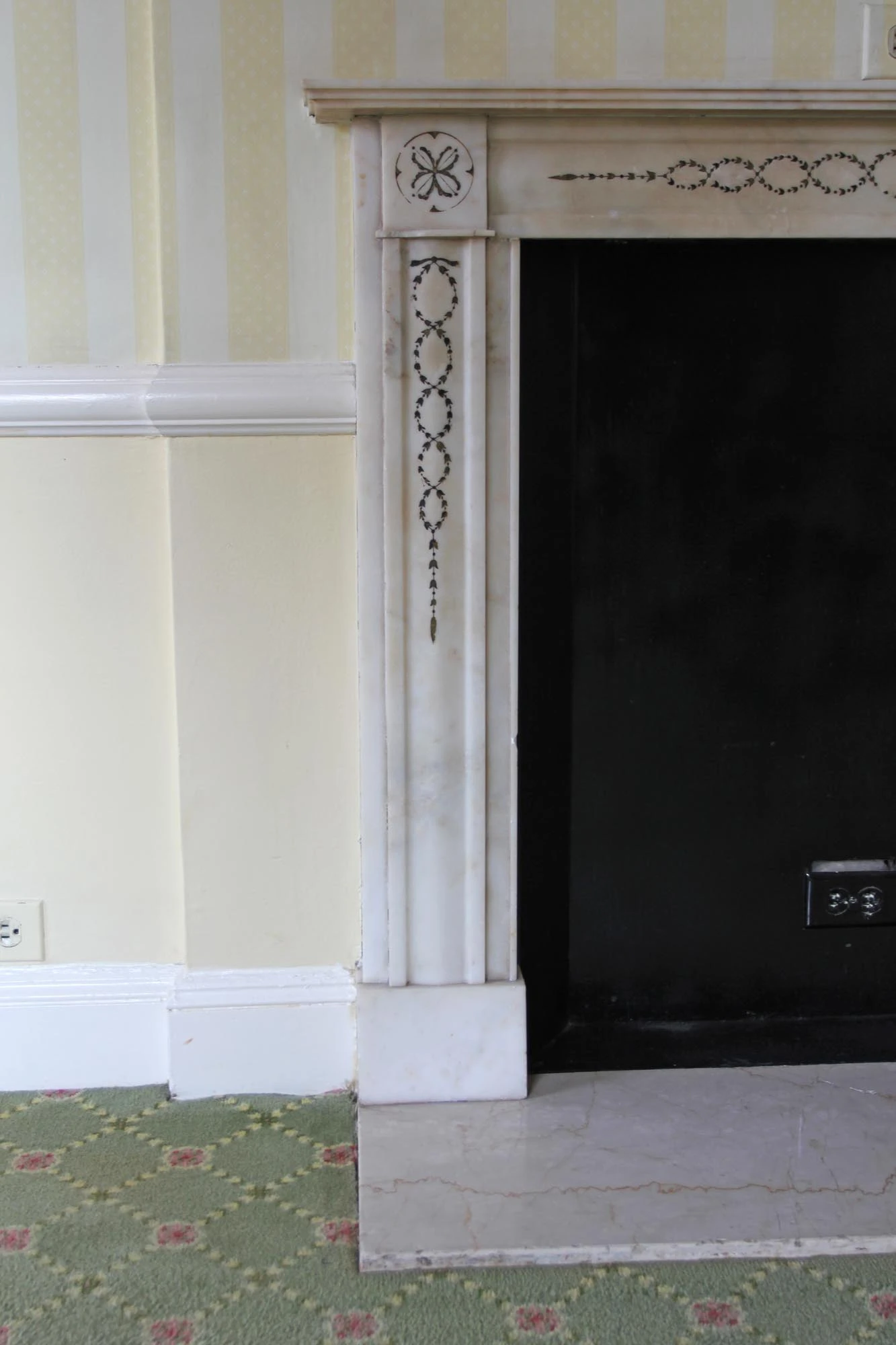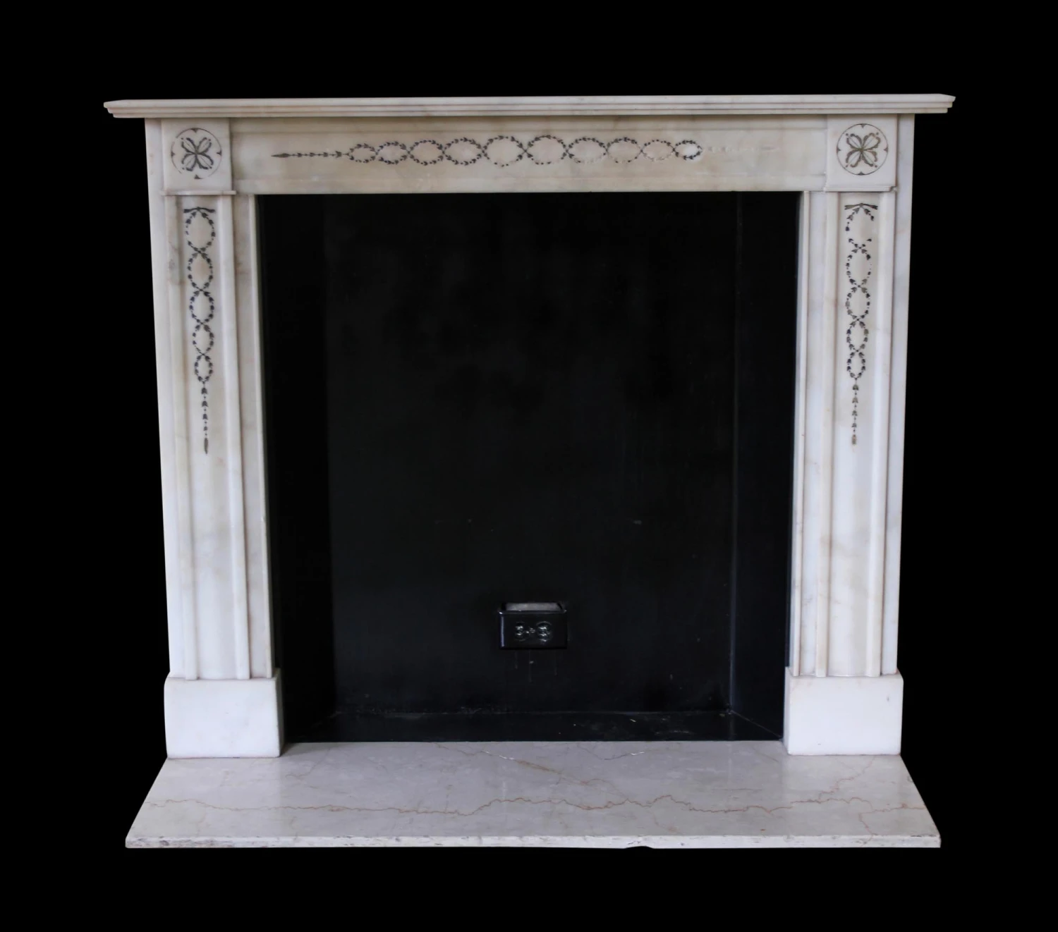 This petite mantel was carved from white marble and is highlighted with detailed and decorative inlay. A wreath-like infinity chain decorates the apron, and is framed by corner floral motifs. The same wreath like pattern runs down the top half of each leg ending as a narrow floral thread. This mantel also has an uncommonly narrow shelf which rises in slight, expanding tiers. A gently worn Crema Marfil marble hearth completes the fireplace.