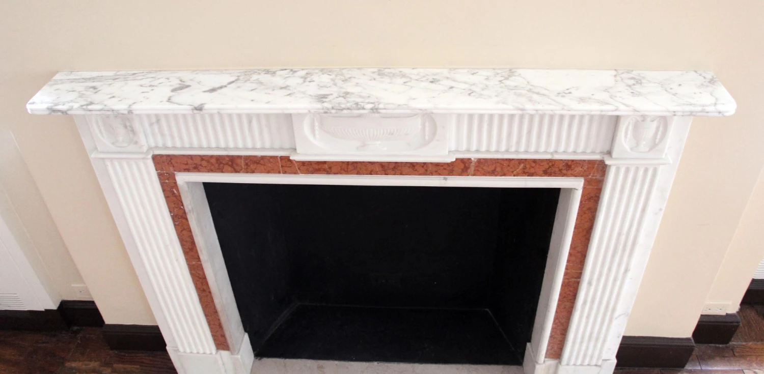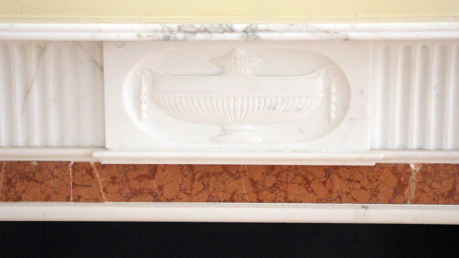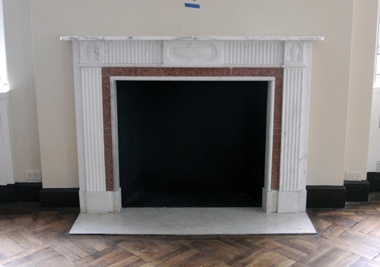 English Regency statuary Carrara and Rosa Verona marble mantel. Circa 1810. This mantel was one of a group of antique mantels imported from Europe and installed in the Waldorf Astoria hotel in the 1930s when the hotel was first built on Park Avenue. It is original to suite H on the 33rd floor of the Towers.
