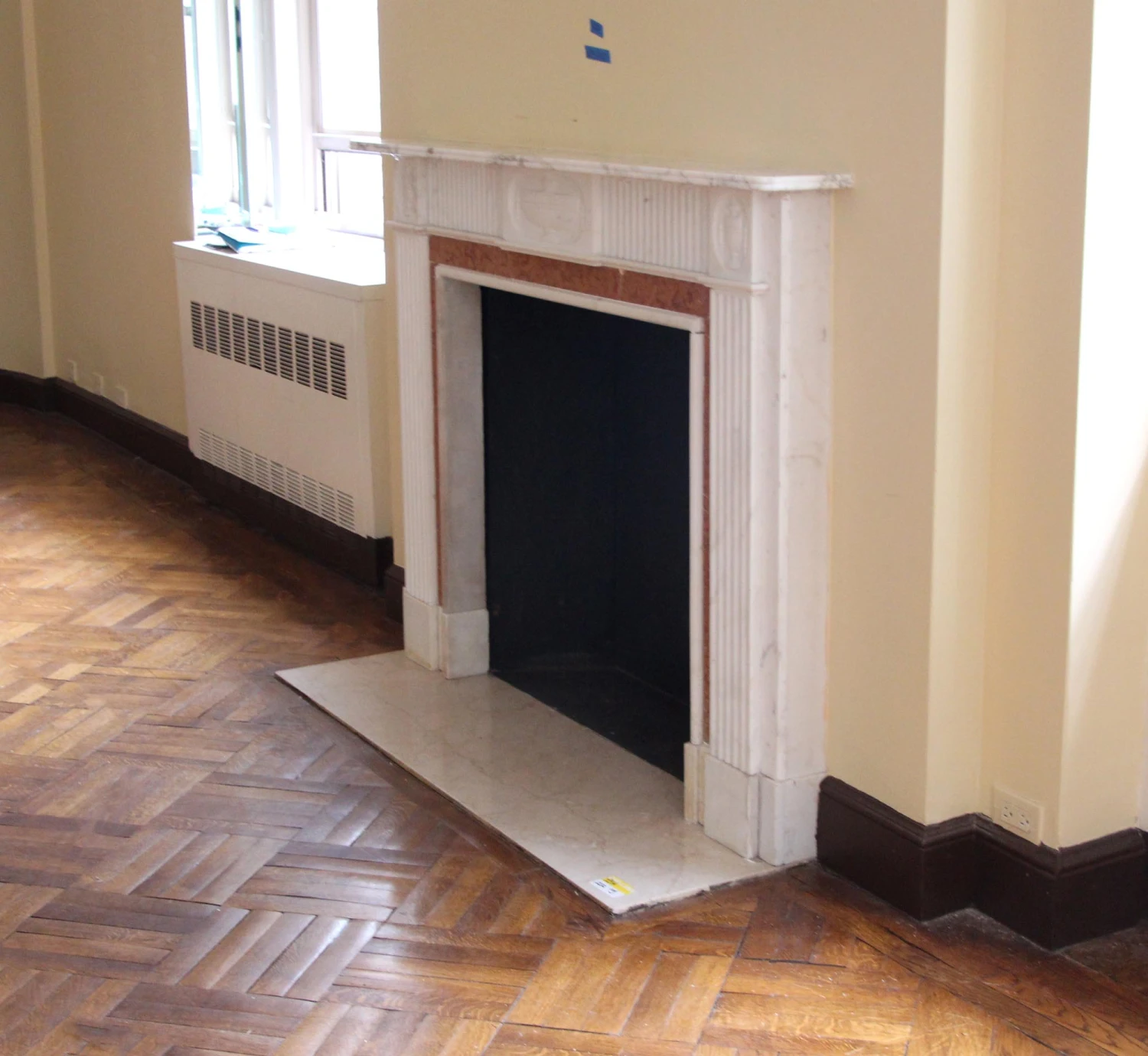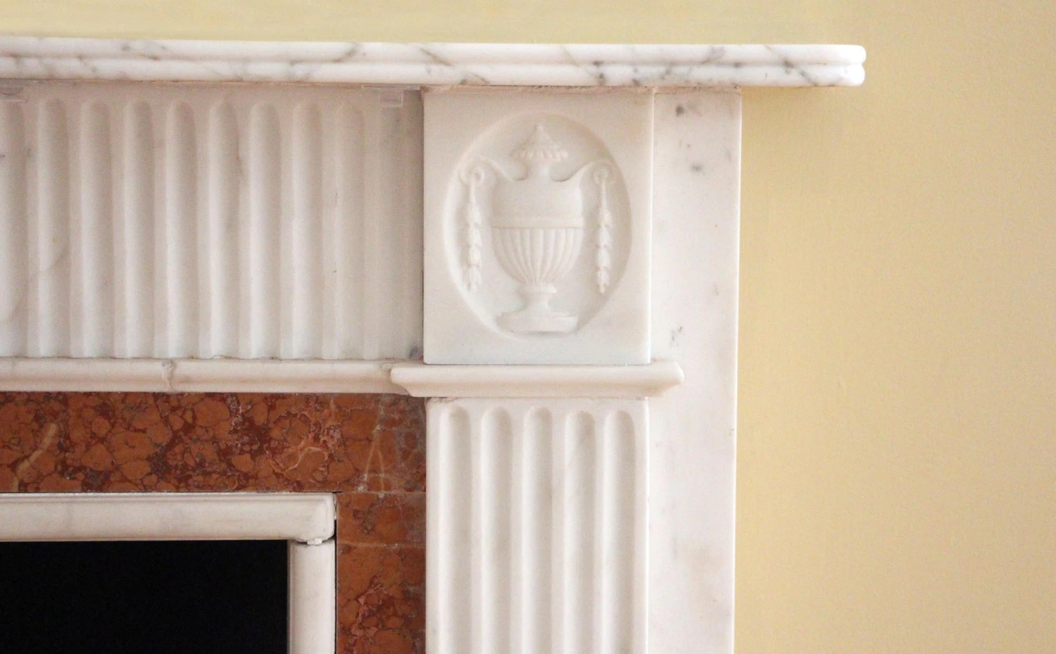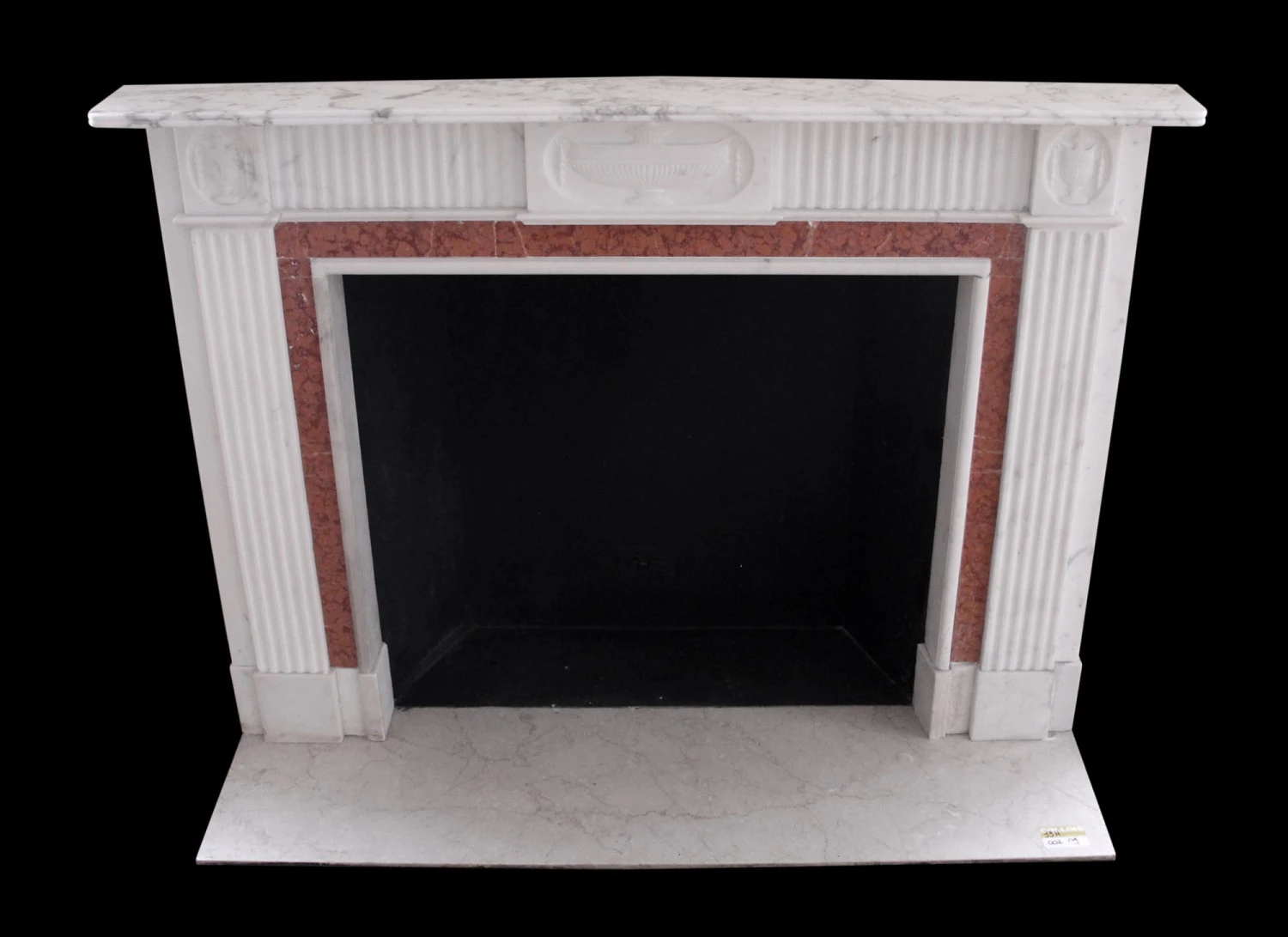 English Regency statuary Carrara and Rosa Verona marble mantel. Circa 1810. This mantel was one of a group of antique mantels imported from Europe and installed in the Waldorf Astoria hotel in the 1930s when the hotel was first built on Park Avenue. It is original to suite H on the 33rd floor of the Towers.
