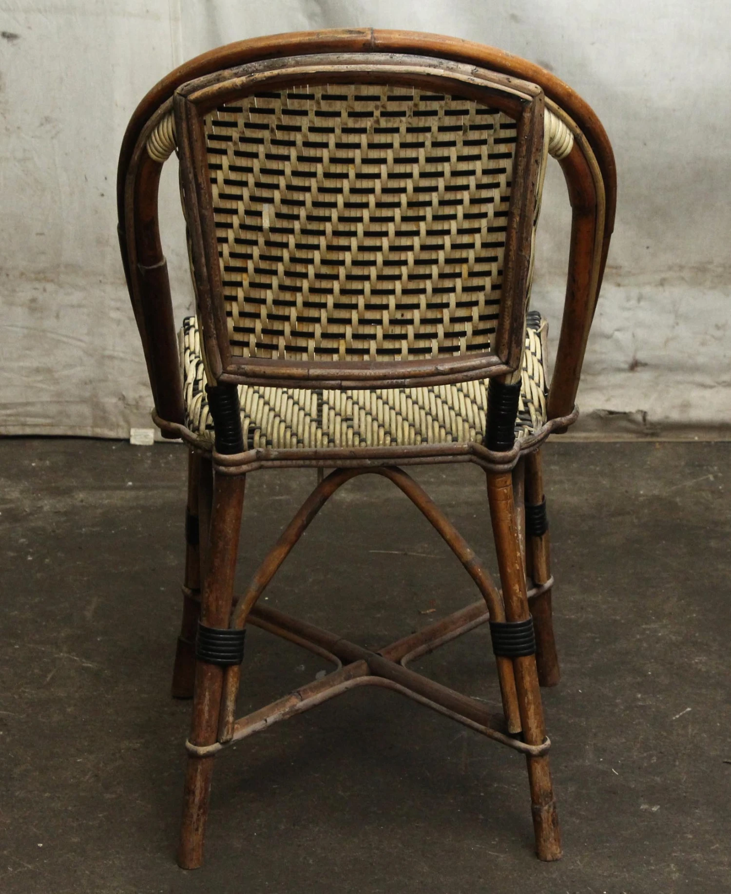 Yellow tone wicker chair with a medium tone wooden frame. Some chairs have wear and damages from age and use. Priced each.