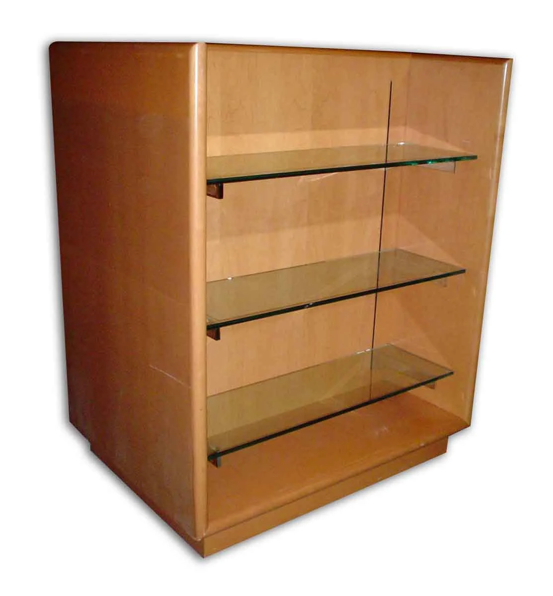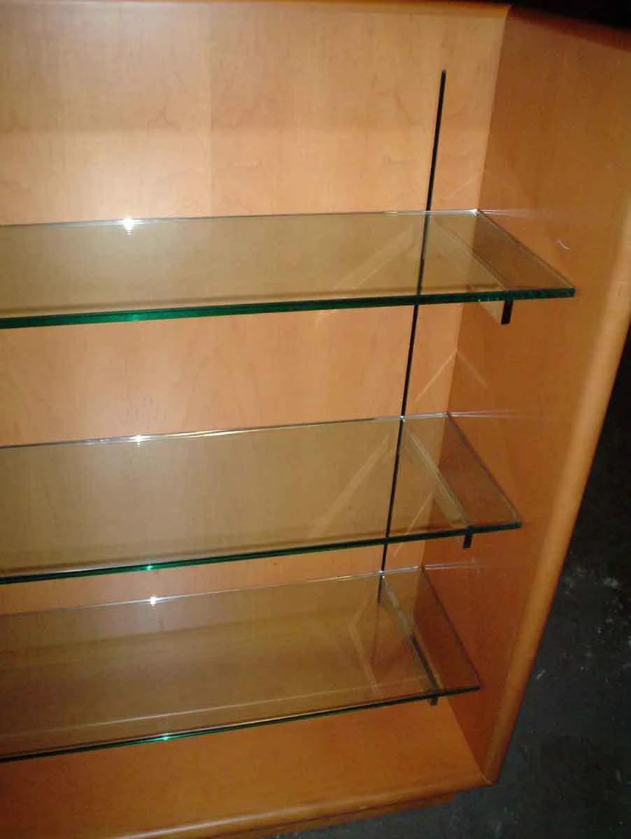 Three glass shelves on each side. Maple veneer with six glass shelves per unit. Priced per unit. Each piece contains six glass shelves that are intact and in excellent condition with no chips or cracks.
