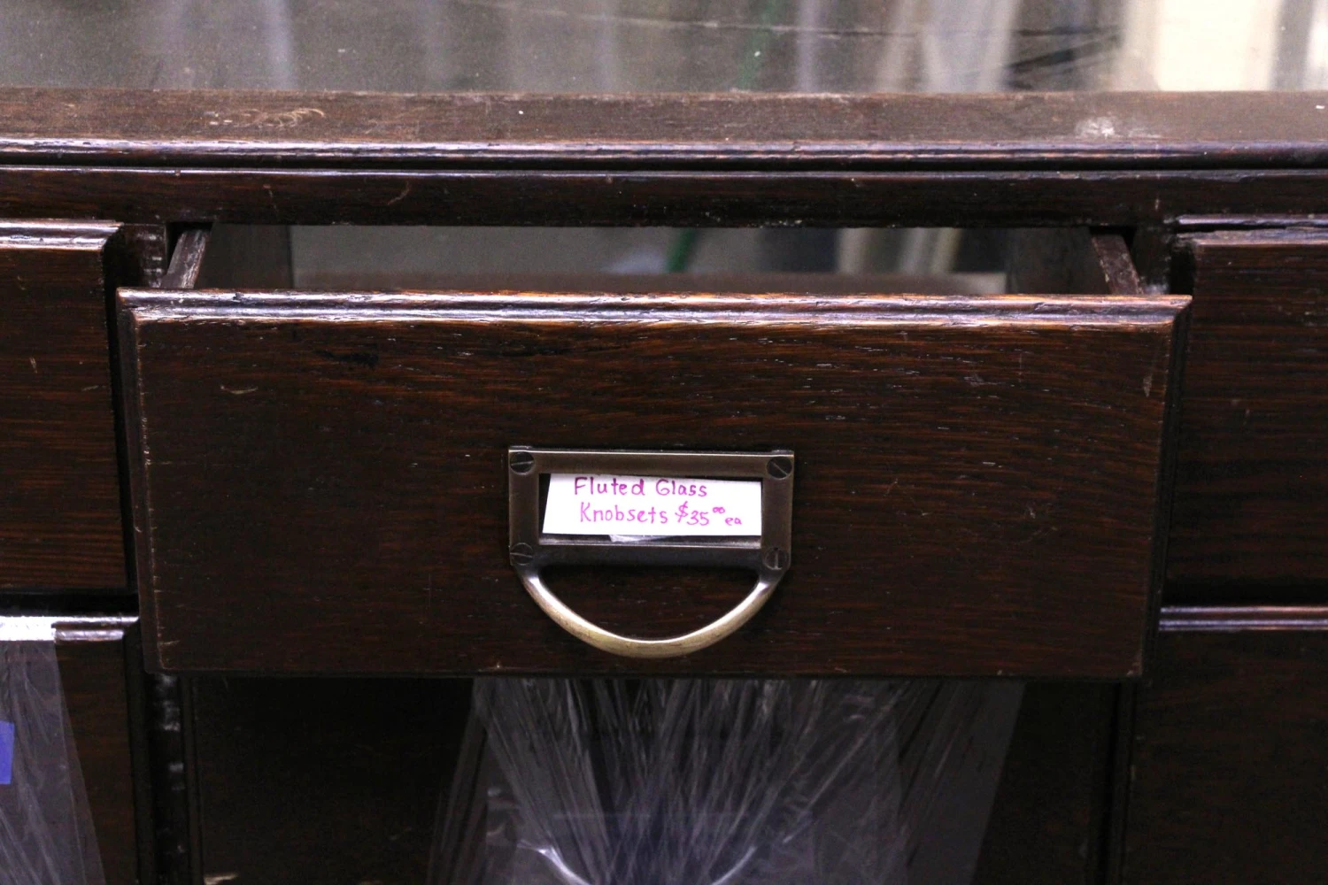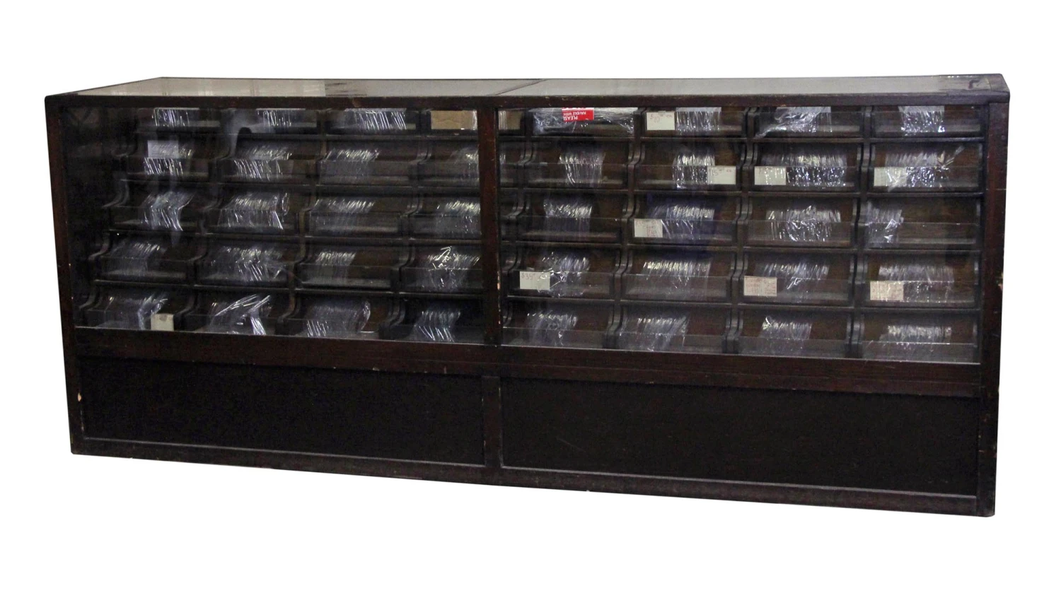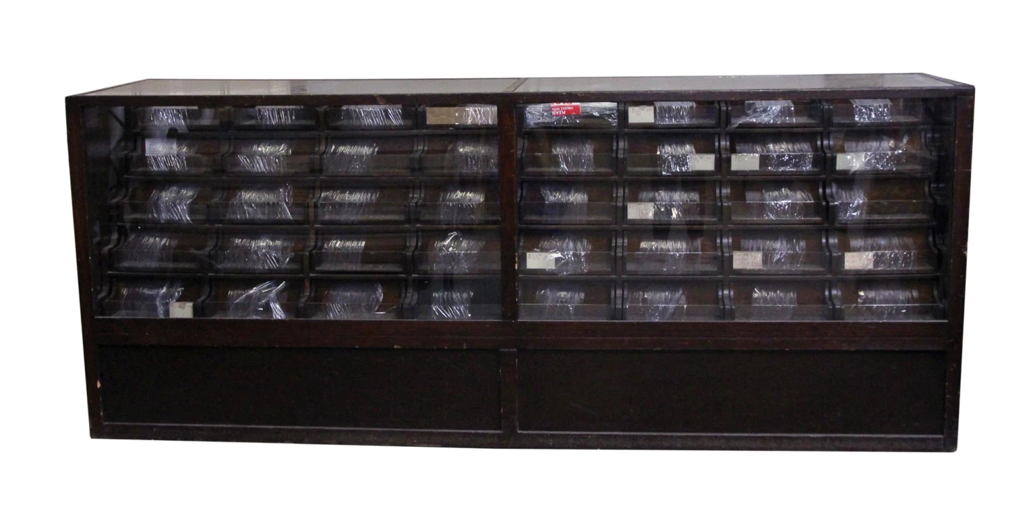 Dark wood tone haberdashery style showcase with 40 total storage drawers made of wood with a glass front. Perfect for a department store to showcase small items.