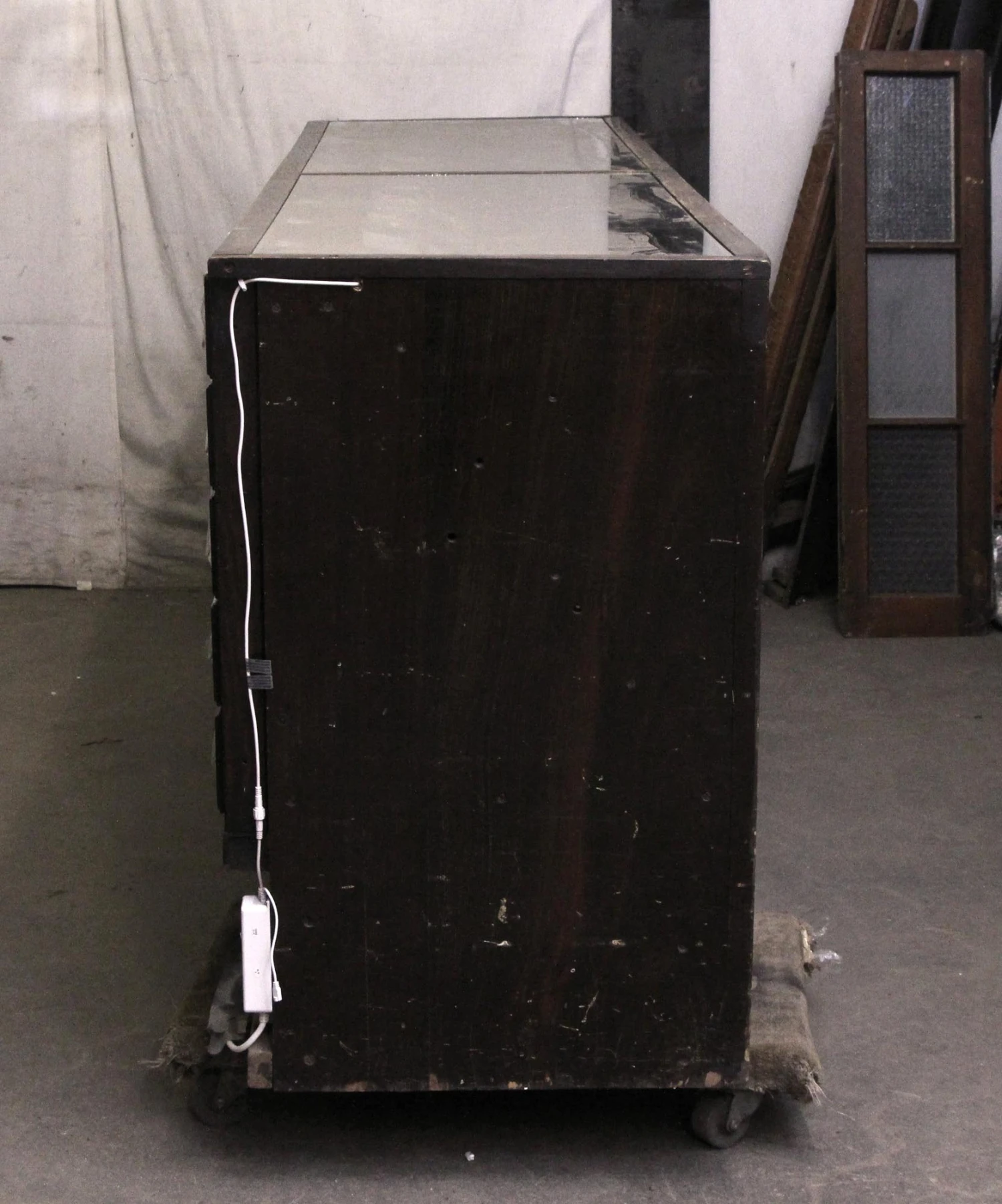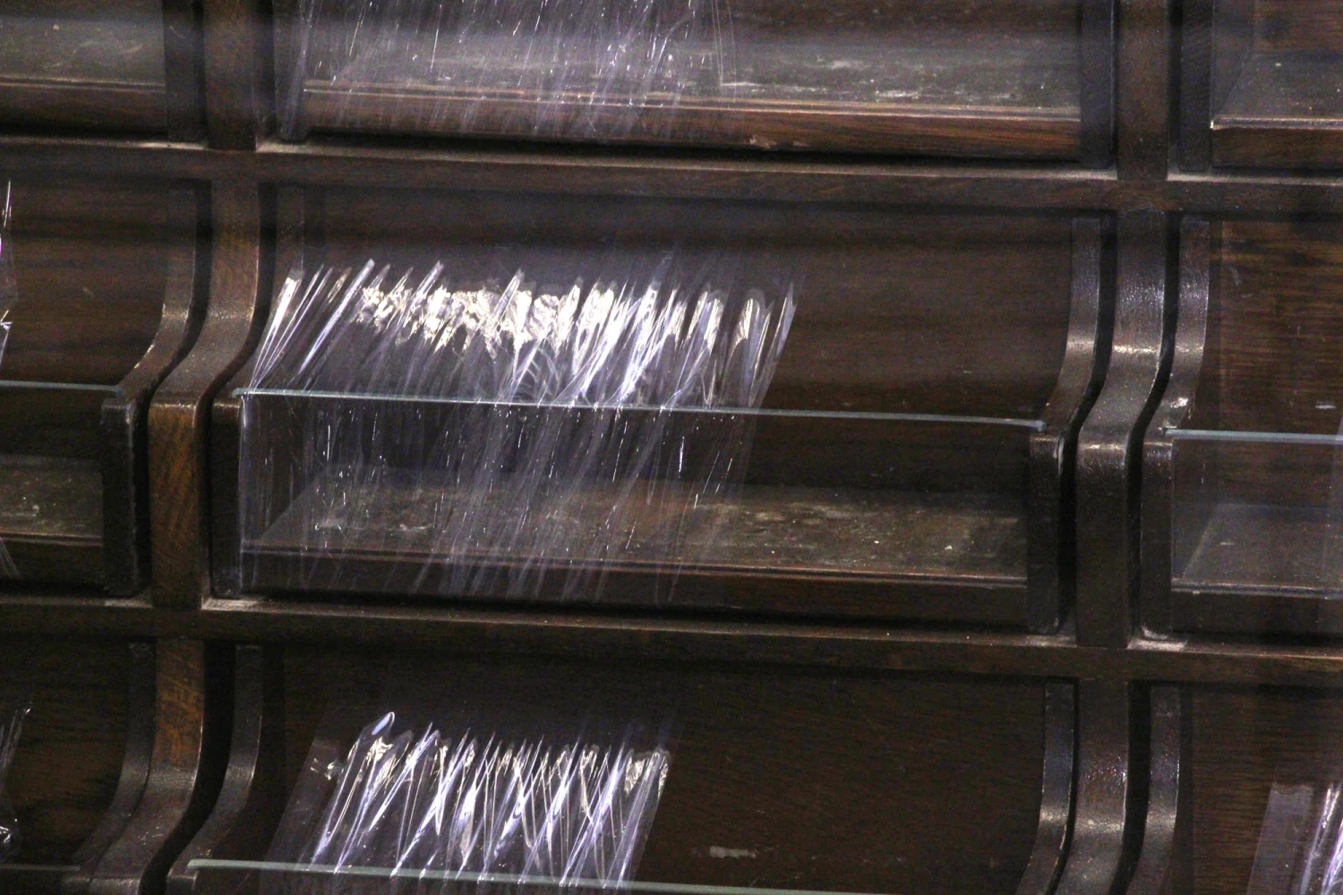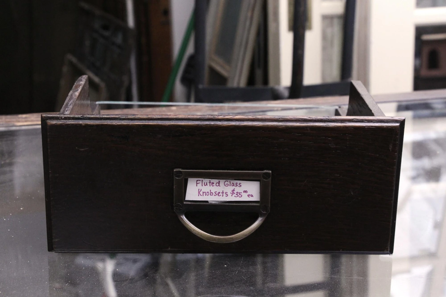 Dark wood tone haberdashery style showcase with 40 total storage drawers made of wood with a glass front. Perfect for a department store to showcase small items.